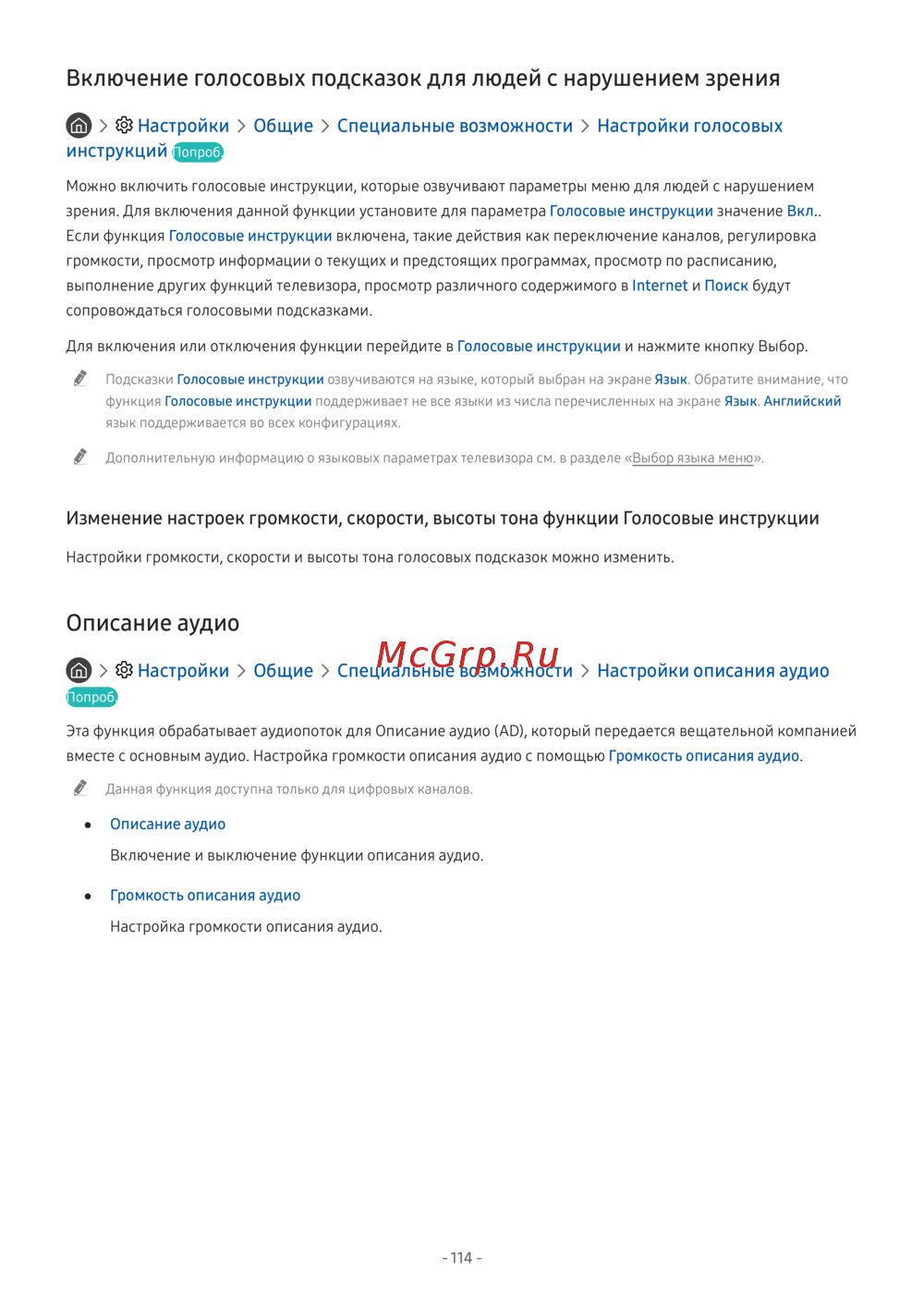 Samsung UE65NU7400U — включение голосовых подсказок для людей с нарушением зрения [114/188]