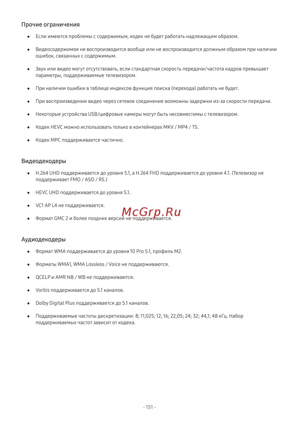 ● H.264 UHD поддерживается до уровня 5.1, а H.264 FHD поддерживается до уровня 4.1. (Телевизор не
