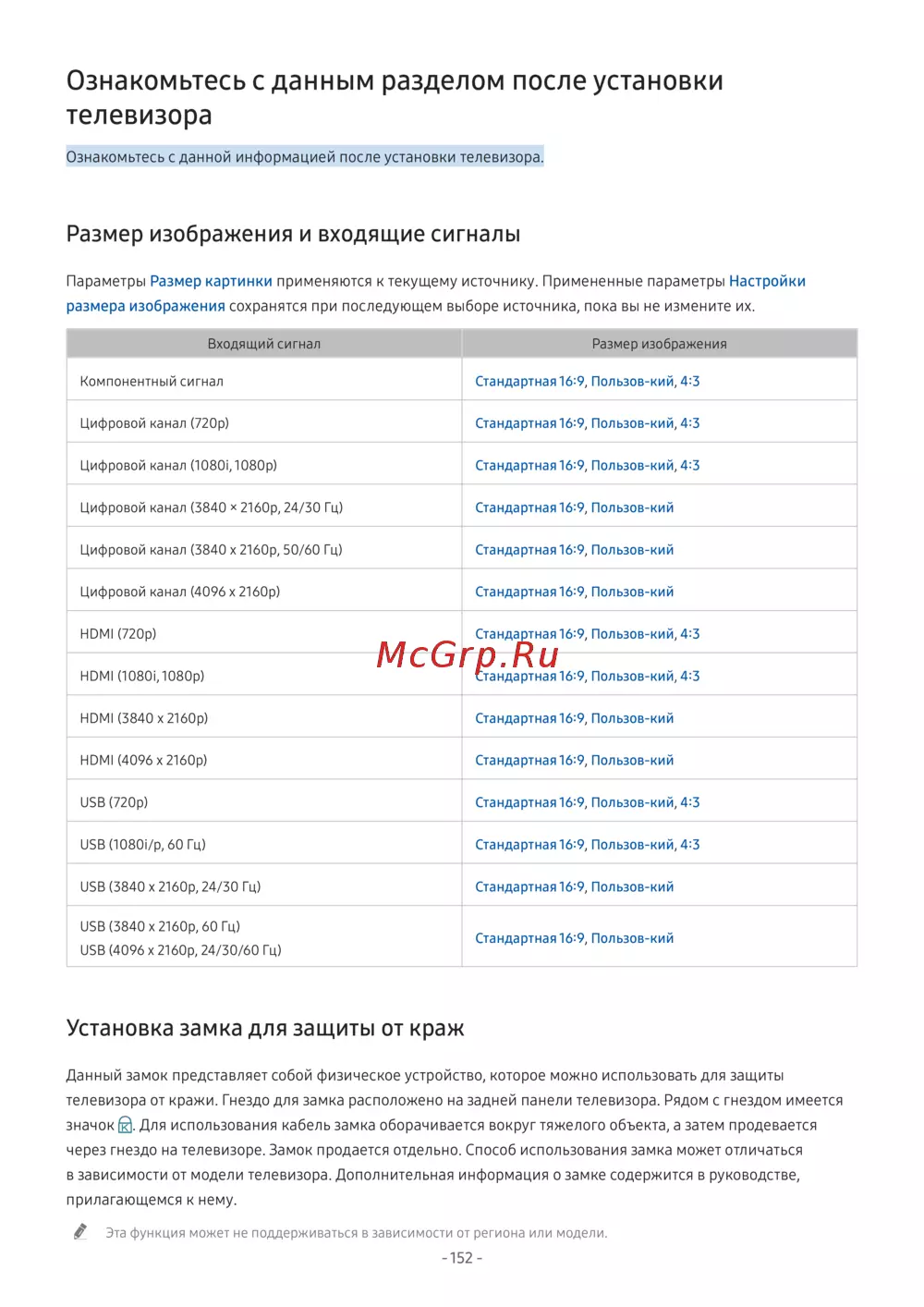 в зависимости от модели телевизора. Дополнительная информация о замке содержится в руководстве,