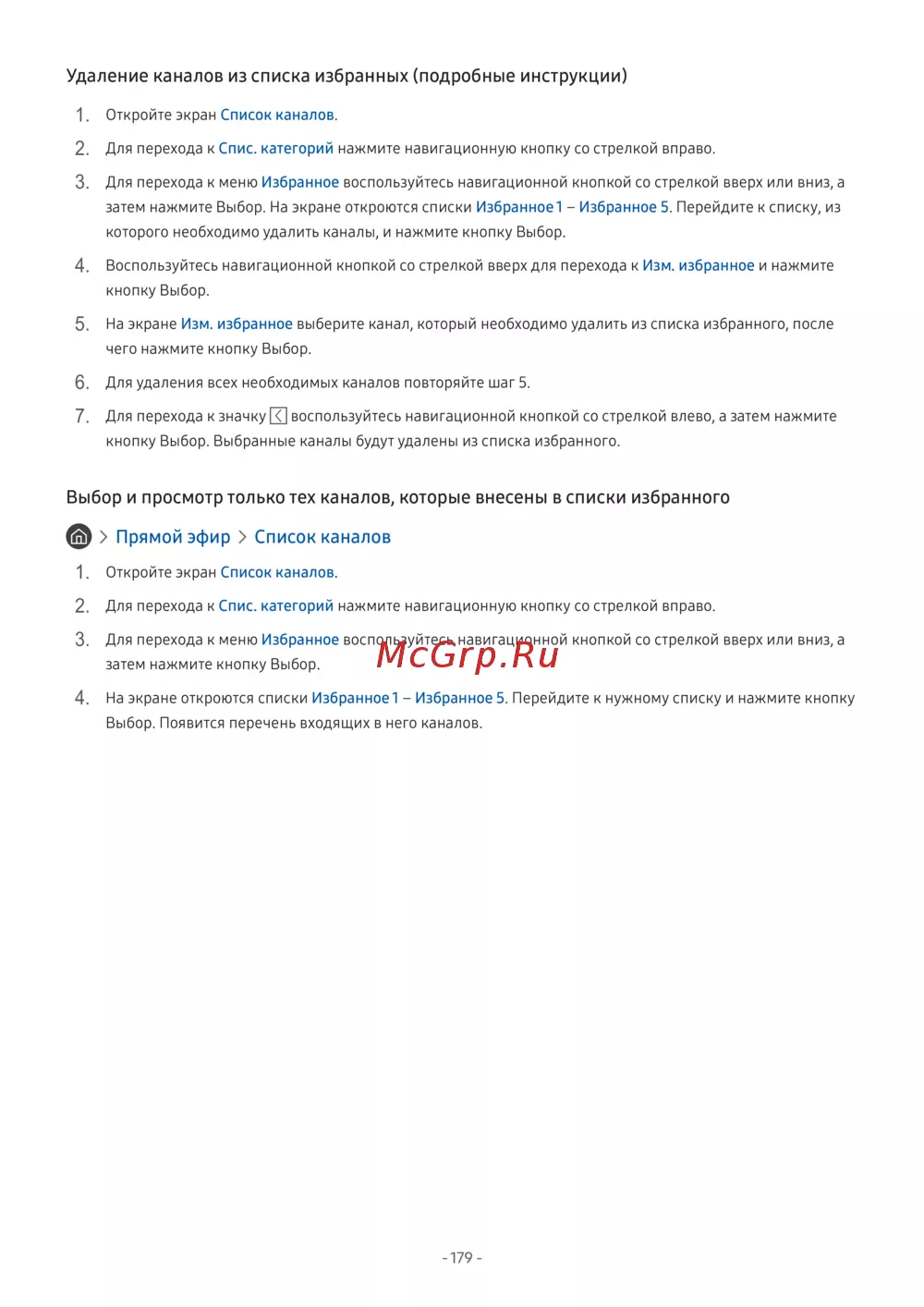 - Удаление каналов из списка избранных подробные инструкции p.179