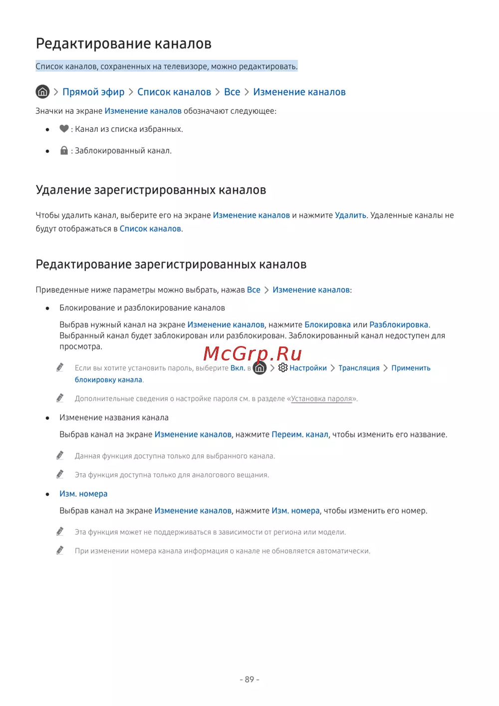 - Удаление каналов из списка избранных подробные инструкции p.179