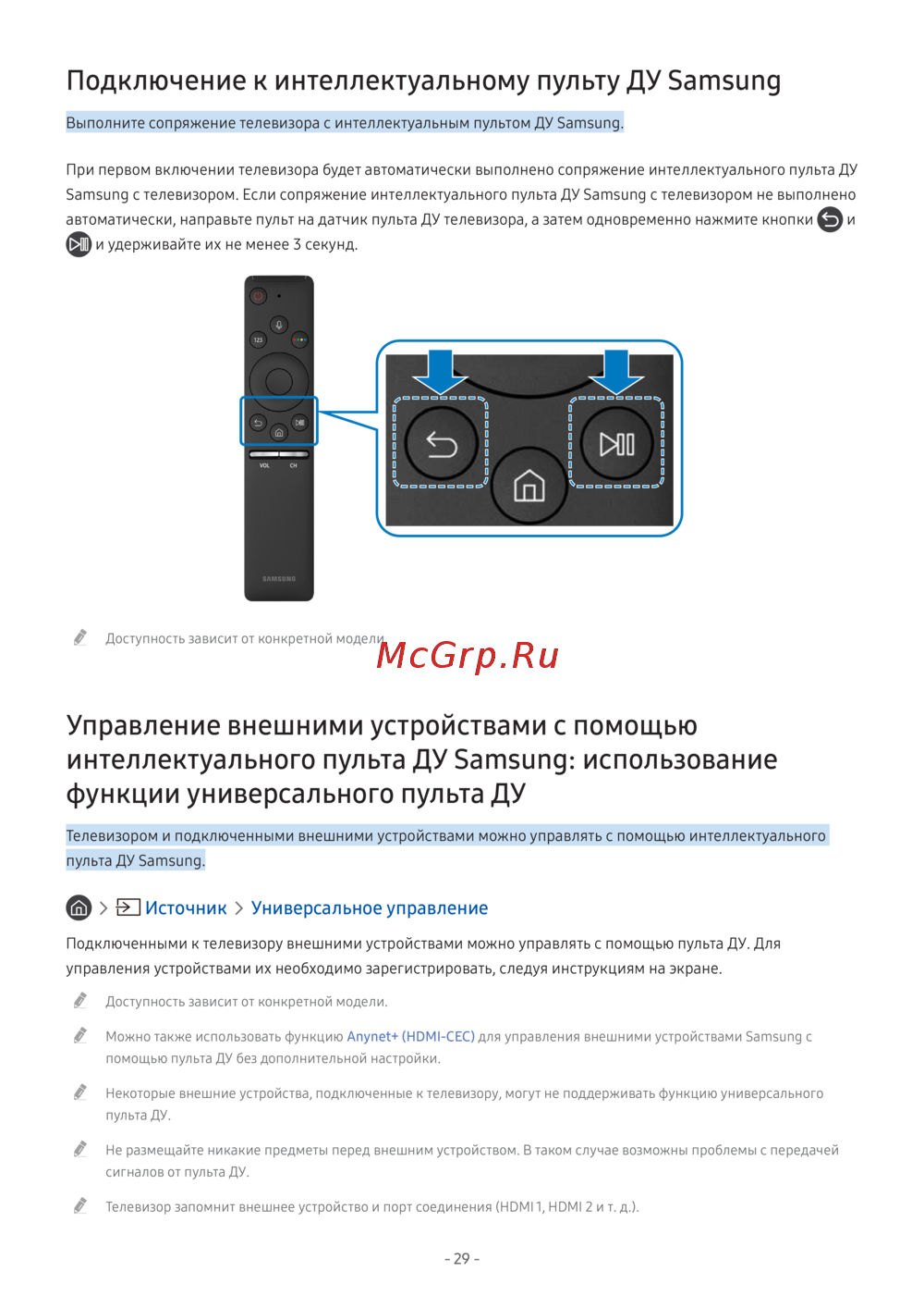 - Описание интеллектуального пульта ду samsung p.134
