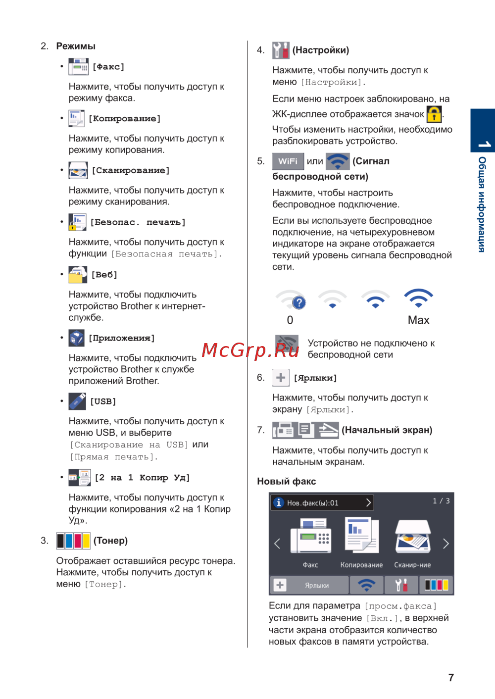 Узнайте о различных режимах работы устройства, включая факс, копирование и сканирование. Настройте беспроводное подключение и управляйте тонером легко.