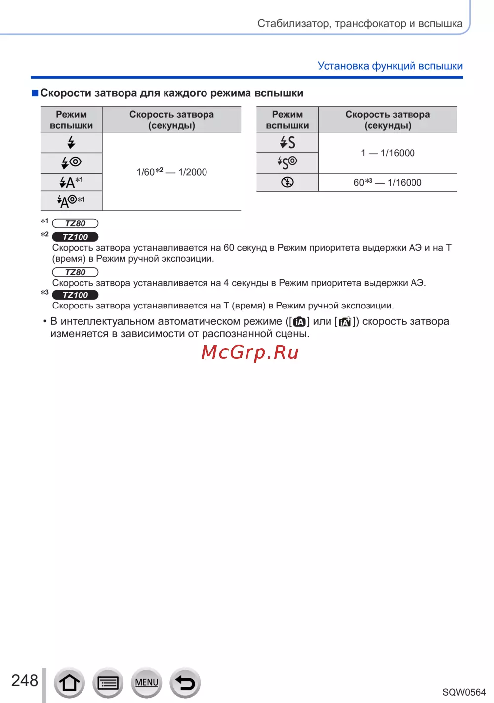 Panasonic Lumix DMC-TZ100EE Black — настройка функций вспышки и скорости затвора для фотоаппаратов [248/406]