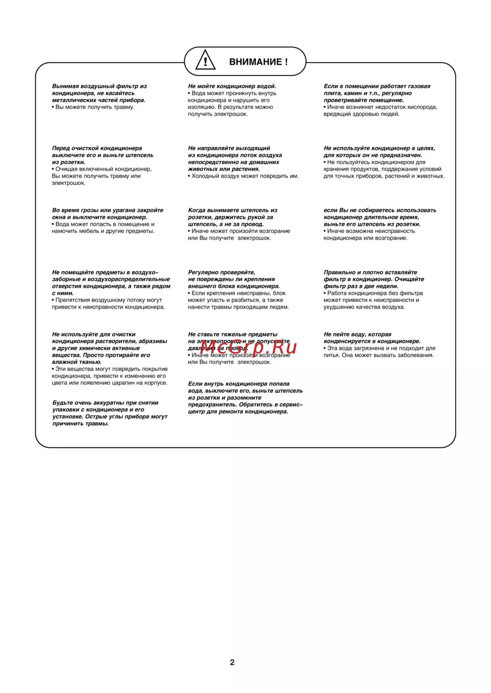 Вынимая воздушный фильтр из кондиционера не касайтесь металлических частей прибора Вы можете получить травму Перед очисткой кондиционера выключите его и выньте штепсель из розетки Очищая включенный кондиционер Вы можете получить травму или электрошок Во время грозы или урагана закройте окна и выключите кондиционер Вода может попасть в помещение и намочить мебель и другие предметы Не помещайте предметы в воздухо заборные и воздухораспределительные отверстия кондиционера а также рядом с ними Препятствия воздушному потоку могут привести к неисправности кондиционера Не используйте для очистки кондиционера растворители абразивы и другие химически активные вещества Просто протирайте его влажной тканью Эти вещества могут повредить покрытие кондиционера привести к изменению его цвета или появлению царапин на корпусе Будьте очень аккуратны при снятии упаковки с кондиционера и его установке Острые углы прибора могут причинить травмы Не мойте кондиционер водой Вода может проникнуть внутрь кондиционера и нарушить его изоляцию В результате можно получить электрошок Не направляйте выходящий из кондиционера поток воздуха непосредственно на домашних животных или растения Если в помещении работает газовая плита камин и т п регулярно проветривайте помещение Иначе возникнет недостаток кислорода вредящий здоровью людей Не используйте кондиционер в целях для которых он не предназначен Холодный воздух может повредить им Не пользуйтесь кондиционером для хранения продуктов поддержания условий для точных приборов растений и животных Когда вынимаете штепсель из розетки держитесь рукой за штепсель а не за провод если Вы не собираетесь использовать кондиционер длительное время выньте его штепсель из розетки Иначе может произойти возгорание или Вы получите электрошок Иначе возможна неисправность кондиционера или возгорание Регулярно проверяйте не повреждены ли крепления внешнего блока кондиционера Правильно и плотно вставляйте фильтр в кондиционер Очищайте фильтр раз в две недели Если крепления неисправны блок может упасть и разбиться а также нанести травмы проходящим людям Работа кондиционера без фильтра может привести к неисправности и ухудшению качества воздуха Не ставьте тяжелые предметы на электропровод и не допускайте давления на провод Не пейте воду которая конденсируется в кондиционере Иначе может произойти возгорание или Вы получите электрошок Если внутрь кондиционера попала вода выключите его выньте штепсель из розетки и разомкните предохранитель Обратитесь в сервисцентр для ремонта кондиционера 2 Эта вода загрязнена и не подходит для питья Она может вызвать заболевания