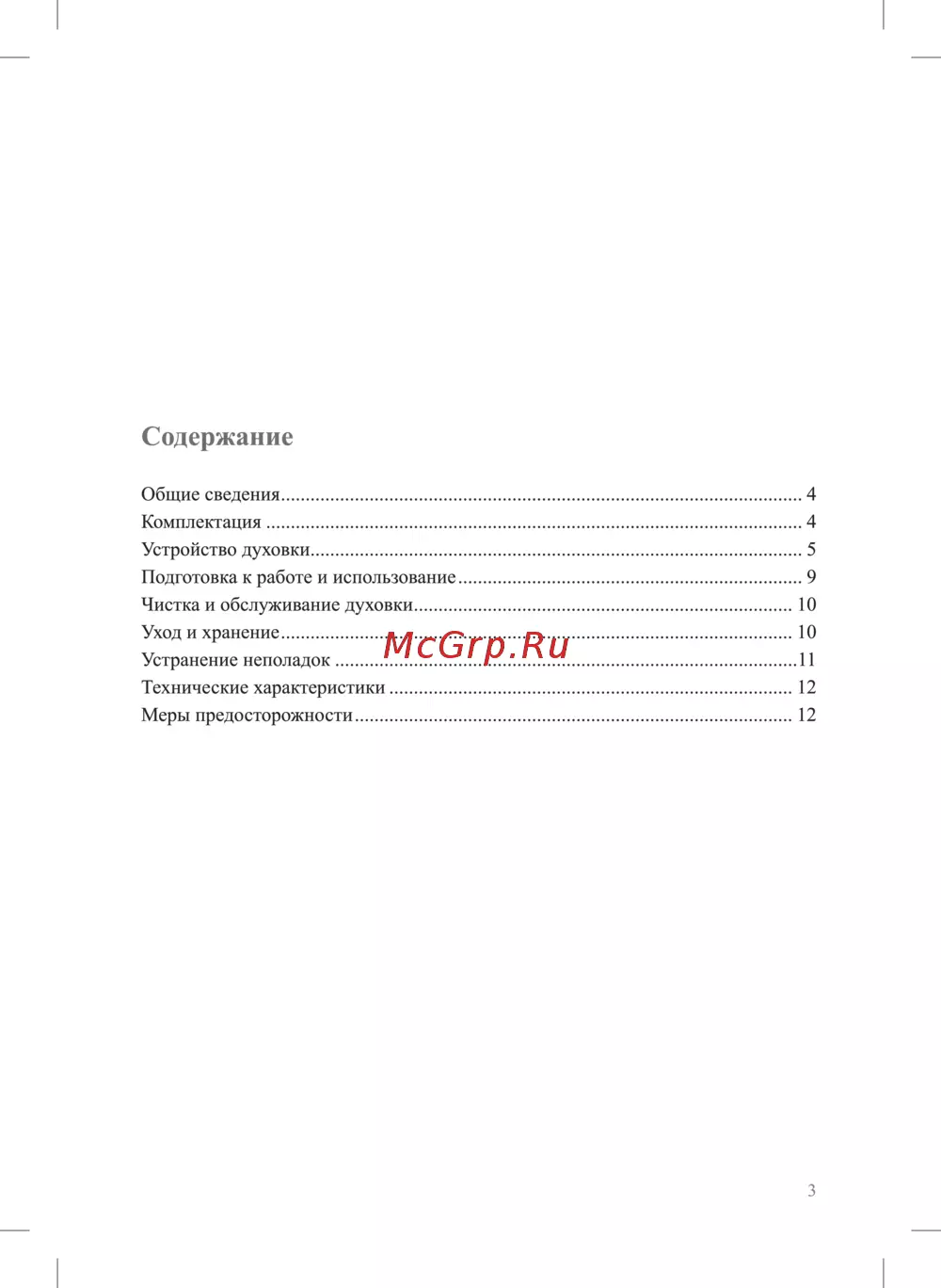 Содержание Общие сведения 4 Комплектация 4 Устройство духовки 5 Подготовка к работе и использование 9 Чистка и обслуживание духовки 10 Уход и хранение 10 Устранение неполадок 11 Технические характеристики 12 Меры предосторожности 12 3