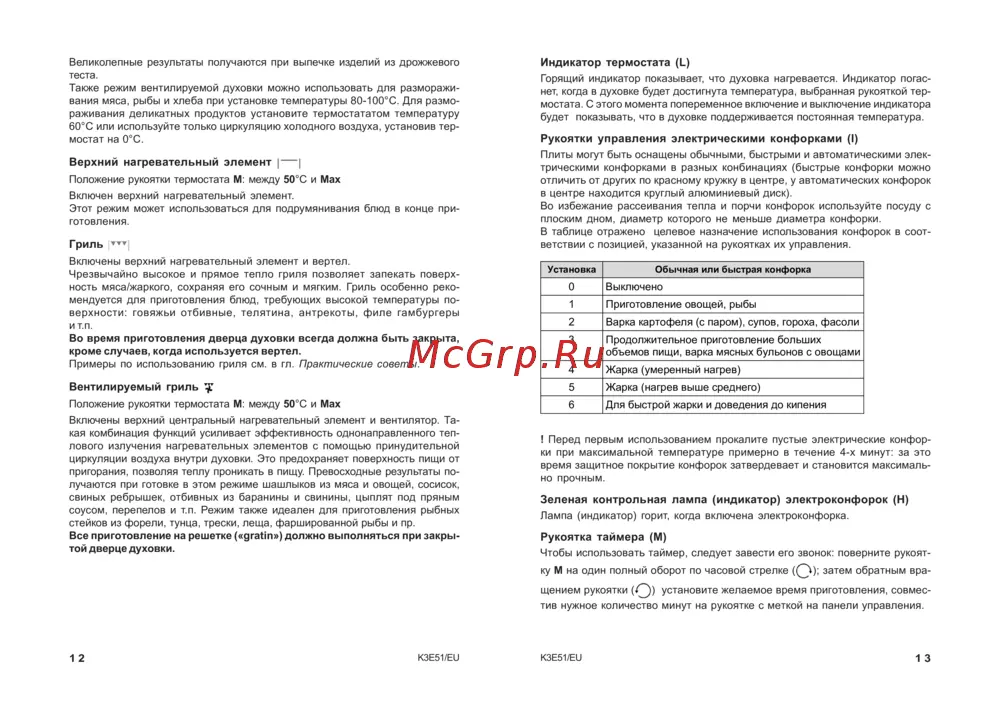 Великолепные результаты получаются при выпечке изделий из дрожжевого теста Также режим вентилируемой духовки можно использовать для разморажи вания мяса рыбы и хлеба при установке температуры 80 100 С Для размо раживания деликатных продуктов установите термостататом температуру 60 С или используйте только циркуляцию холодного воздуха установив тер мостат на 0 С Верхний нагревательный элемент Положение рукоятки термостата М между 50 С и Мах Включен верхний нагревательный элемент Этот режим может использоваться для подрумянивания блюд в конце при готовления Гриль Включены верхний нагревательный элемент и вертел Чрезвычайно высокое и прямое тепло гриля позволяет запекать поверх ность мяса жаркого сохраняя его сочным и мягким Гриль особенно реко мендуется для приготовления блюд требующих высокой температуры по верхности говяжьи отбивные телятина антрекоты филе гамбургеры и т п Во время приготовления дверца духовки всегда должна быть закрыта кроме случаев когда используется вертел Примеры по использованию гриля см в гл Практические советы Индикатор термостата Ь Горящий индикатор показывает что духовка нагревается Индикатор погас нет когда в духовке будет достигнута температура выбранная рукояткой тер мостата С этого момента попеременное включение и выключение индикатора будет показывать что в духовке поддерживается постоянная температура Рукоятки управления электрическими конфорками I Плиты могут быть оснащены обычными быстрыми и автоматическими элек трическими конфорками в разных конбинациях быстрые конфорки можно отличить от других по красному кружку в центре у автоматических конфорок в центре находится круглый алюминиевый диск Во избежание рассеивания тепла и порчи конфорок используйте посуду с плоским дном диаметр которого не меньше диаметра конфорки В таблице отражено целевое назначение использования конфорок в соот ветствии с позицией указанной на рукоятках их управления Установка Обычная или быстрая конфорка 0 Выключено 1 Приготовление овощей рыбы 2 Варка картофеля спаром супов гороха фасоли 3 Продолжительное приготовление больших объемов пищи варка мясных бульонов с овощами 4 Жарка умеренный нагрев Вентилируемый гриль 5 Жарка нагрев выше среднего Положение рукоятки термостата М между 50 С и Мах 6 Для быстрой жарки и доведения до кипения Включены верхний центральный нагревательный элемент и вентилятор Та кая комбинация функций усиливает эффективность однонаправленного теп лового излучения нагревательных элементов с помощью принудительной циркуляции воздуха внутри духовки Это предохраняет поверхность пищи от пригорания позволяя теплу проникать в пищу Превосходные результаты по лучаются при готовке в этом режиме шашлыков из мяса и овощей сосисок свиных ребрышек отбивных из баранины и свинины цыплят под пряным соусом перепелов и т п Режим также идеален для приготовления рыбных стейков из форели тунца трески леща фаршированной рыбы и пр Все приготовление на решетке gratin должно выполняться при закры той дверце духовки Перед первым использованием прокалите пустые электрические конфор ки при максимальной температуре примерно в течение 4 х минут за это время защитное покрытие конфорок затвердевает и становится максималь но прочным Зеленая контрольная лампа индикатор электроконфор