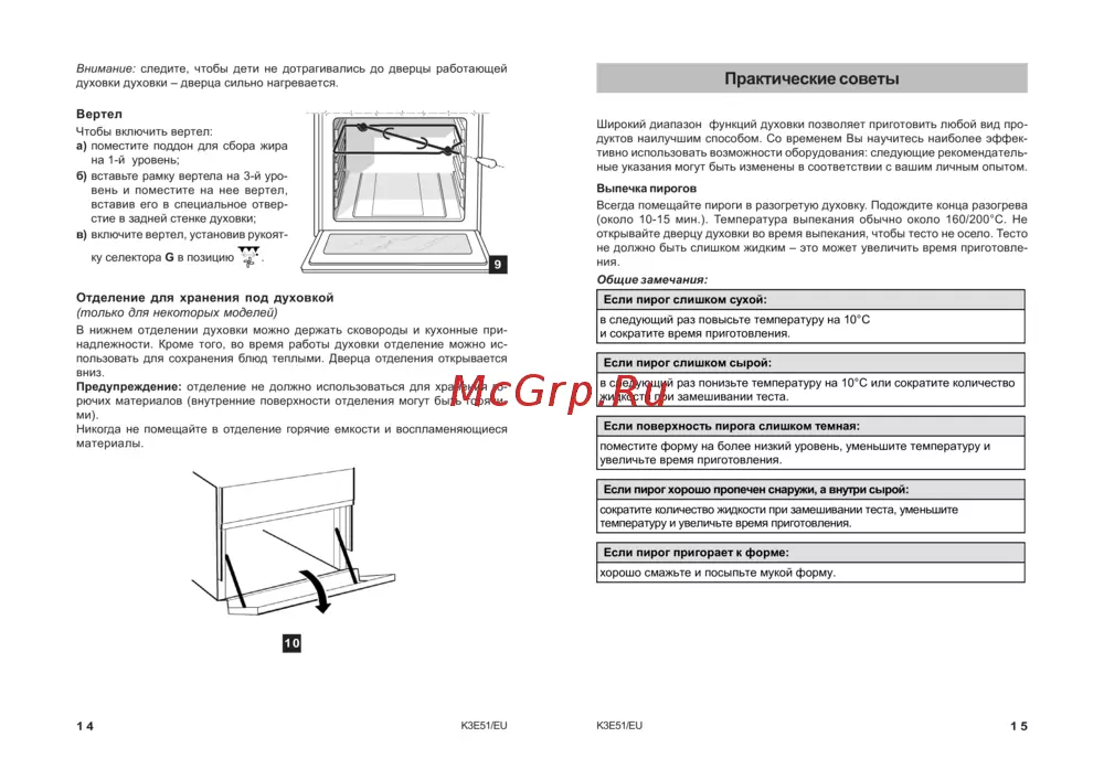 Внимание следите чтобы дети не дотрагивались до дверцы работающей духовки духовки дверца сильно нагревается Практические советы Вертел Широкий диапазон функций духовки позволяет приготовить любой вид про дуктов наилучшим способом Со временем Вы научитесь наиболее эффек тивно использовать возможности оборудования следующие рекомендатель ные указания могут быть изменены в соответствии с вашим личным опытом Чтобы включить вертел а поместите поддон для сбора жира на 1 й уровень б вставьте рамку вертела на 3 й уро вень и поместите на нее вертел вставив его в специальное отвер стие в задней стенке духовки в включите вертел установив рукоят Выпечка пирогов Всегда помещайте пироги в разогретую духовку Подождите конца разогрева около 10 15 мин Температура выпекания обычно около 160 200 С Не открывайте дверцу духовки во время выпекания чтобы тесто не осело Тесто не должно быть слишком жидким это может увеличить время приготовле ния ку селектора С в позицию Общие замечания Отделение для хранения под духовкой Если пирог слишком сухой только для некоторых моделей В нижнем отделении духовки можно держать сковороды и кухонные при надлежности Кроме того во время работы духовки отделение можно ис пользовать для сохранения блюд теплыми Дверца отделения открывается вниз Предупреждение отделение не должно использоваться для хранения го рючих материалов внутренние поверхности отделения могут быть горячи ми Никогда не помещайте в отделение горячие емкости и воспламеняющиеся материалы в следующий раз повысьте температуру на 10 С и сократите время приготовления Если пирог слишком сырой в следующий раз понизьте температуру на 10 С или сократите количество жидкости при замешивании теста Если поверхность пирога слишком темная поместите форму на более низкий уровень уменьшите температуру и увеличьте время приготовления Если пирог хорошо пропечен снаружи а внутри сырой сократите количество жидкости при замешивании теста уменьшите температуру и увеличьте время приготовления Если пирог пригорает к форме хорошо смажьте и посыпьте мукой форму 14 КЗЕ51 Еи КЗЕ51 Еи 15