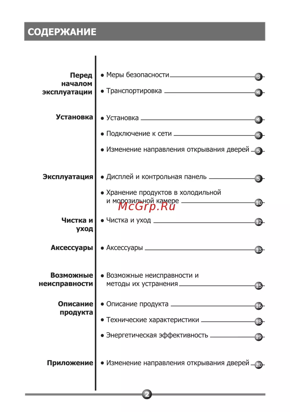 СОДЕРЖАНИЕ Перед началом эксплуатации Меры безопасности______________________ Установка Установка______________________________ Транспортировка________________________ Подключение к сети______________________ Изменение направления открывания дверей _ф_ Эксплуатация Дисплей и контрольная панель____________ Хранение продуктов в холодильной и морозильной камере__________________ Чистка и уход Аксессуары Возможные неисправности Описание продукта Чистка и уход___________________________ Аксессуары_____________________________ ф Возможные неисправности и методы их устранения__________________ Описание продукта______________________ Технические характеристики______________ Энергетическая эффективность____________ Приложение Изменение направления открывания дверей О