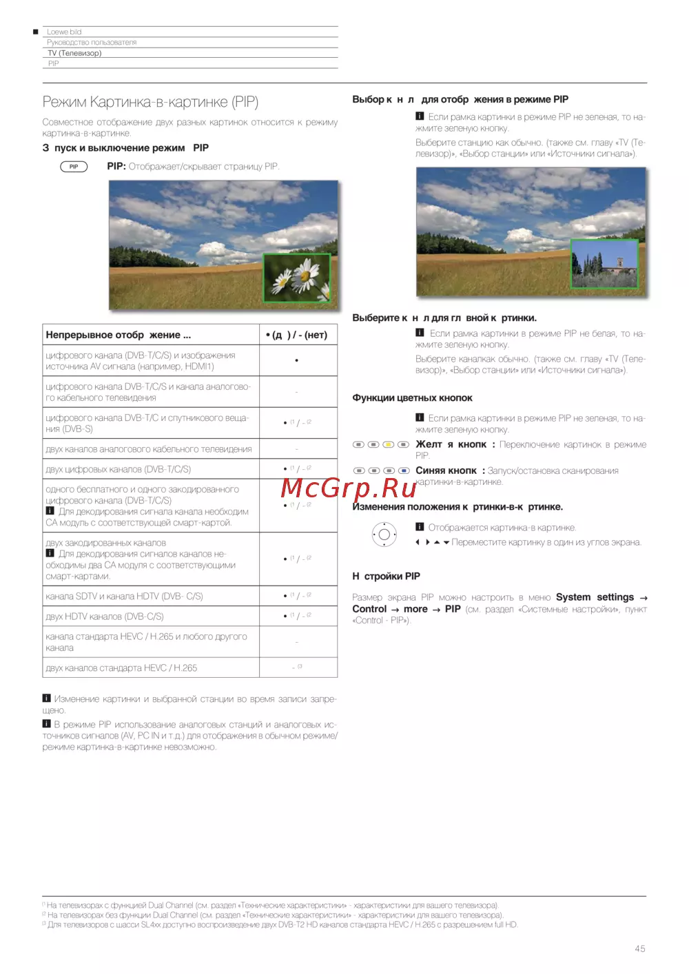 В режиме PIP использование аналоговых станций и аналоговых ис-