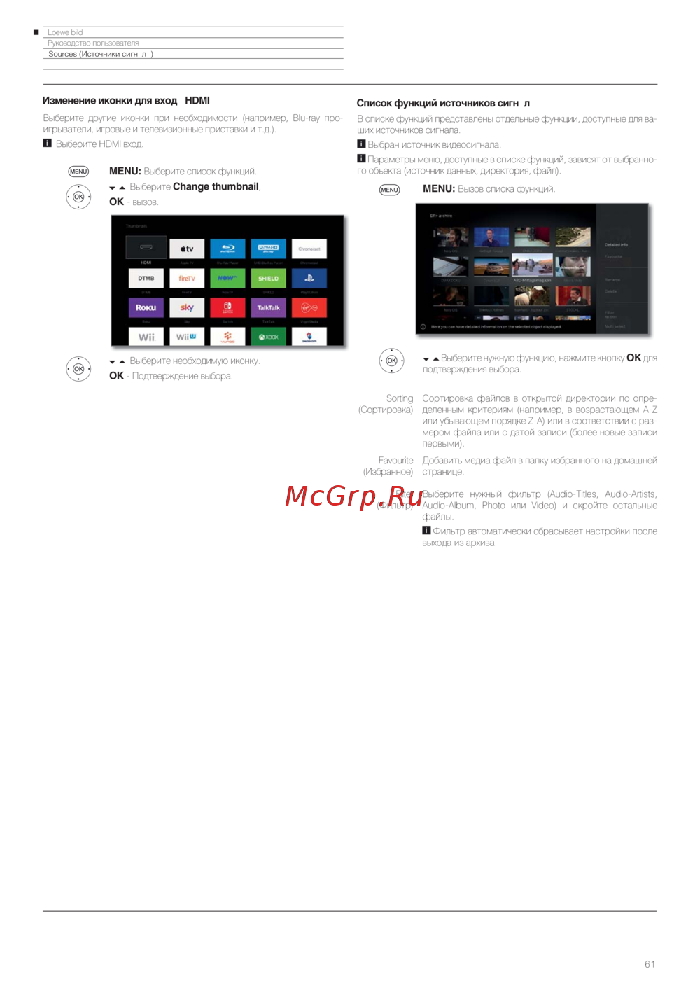 Изучите функции источников сигнала, сортировку файлов и управление избранным. Узнайте, как настраивать иконки и фильтры для удобства использования.