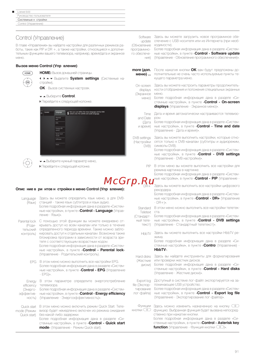 В главе «Управление» вы найдете настройки для различных режимов ра-