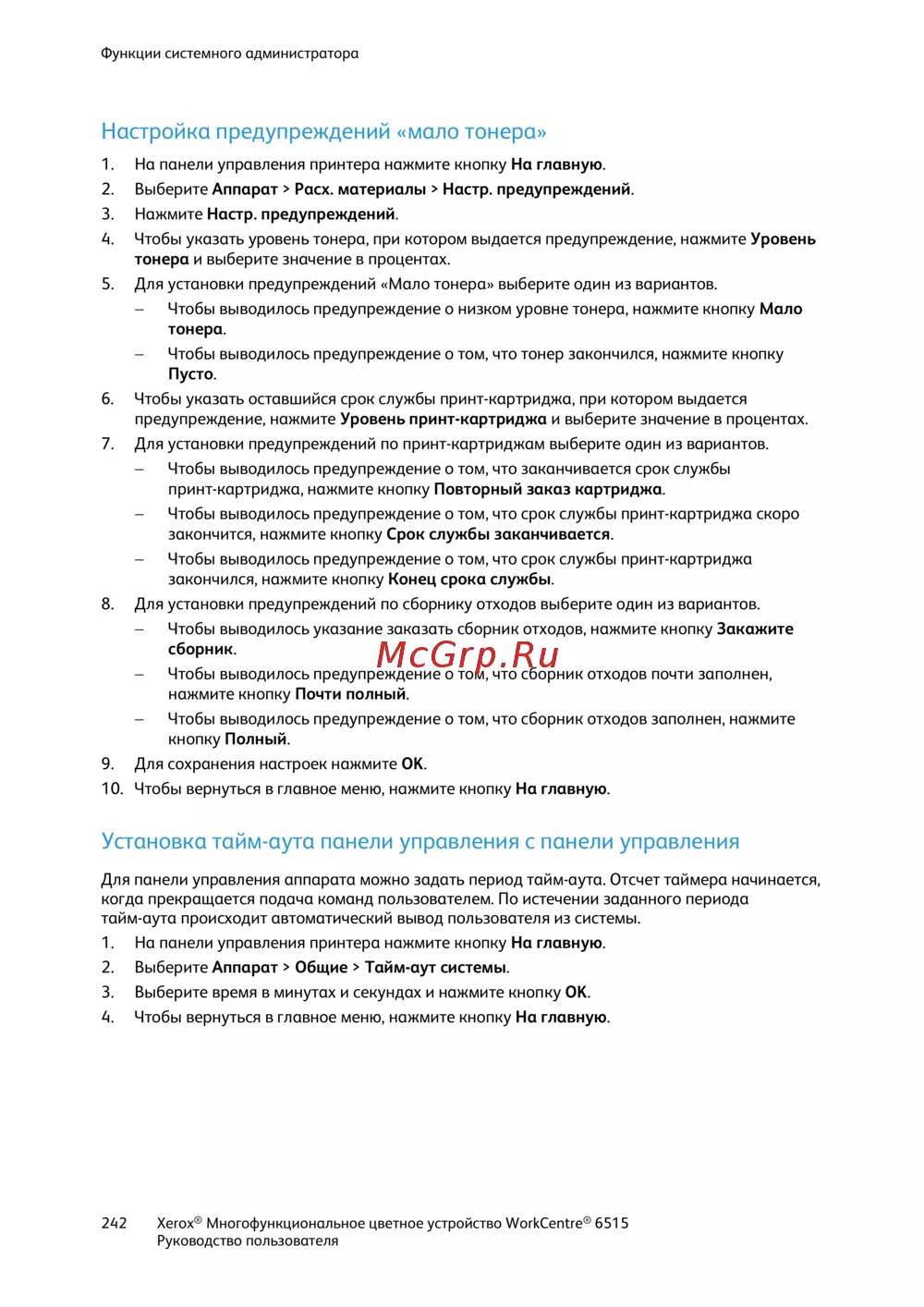 Xerox WorkCentre 6515VDNI Черный, голубой, пурпурный, желтый [242/320] Установка тайм аута панели управления с панели управления