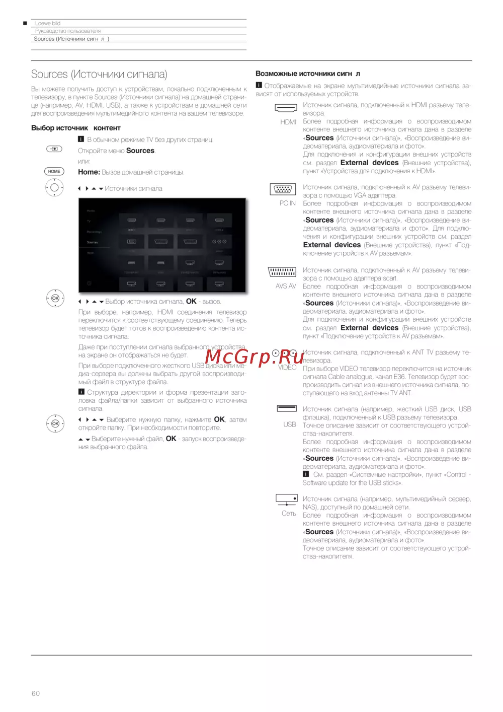 телевизору, в пункте Sources (Источники сигнала) на домашней страни-