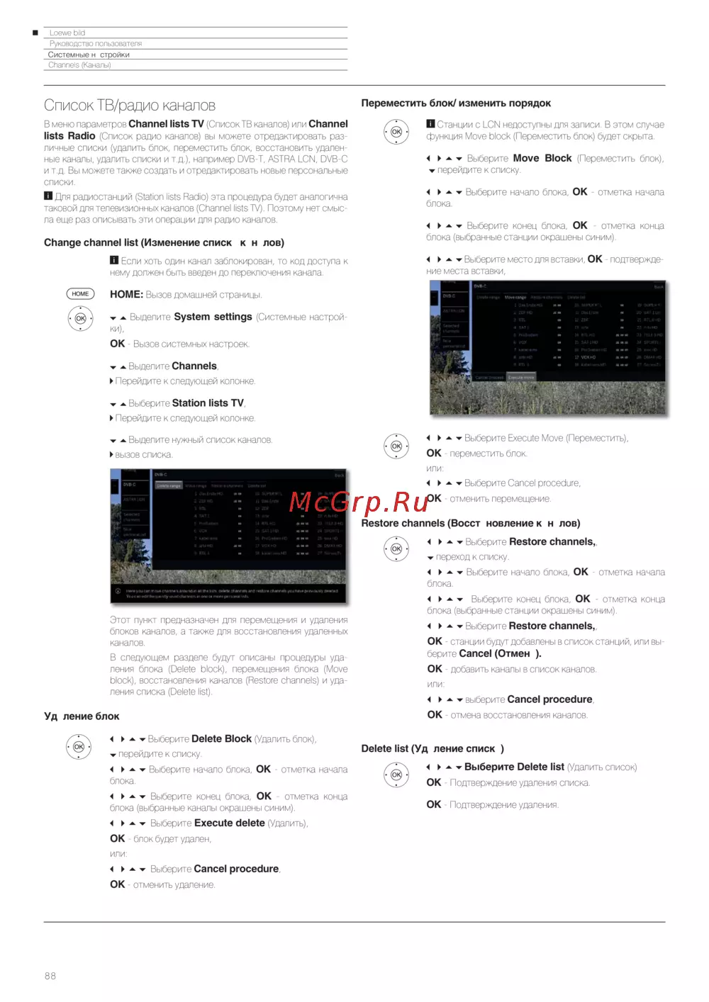 Узнайте, как редактировать списки ТВ и радио каналов, перемещать и восстанавливать блоки, а также удалять ненужные списки. Подробное руководство по системным настройкам.
