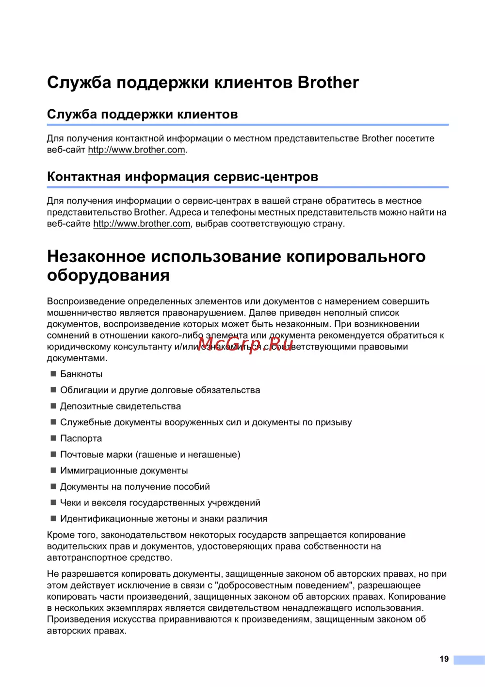Brother DCP-T300 — служба поддержки клиентов и законность копирования документов [19/20]