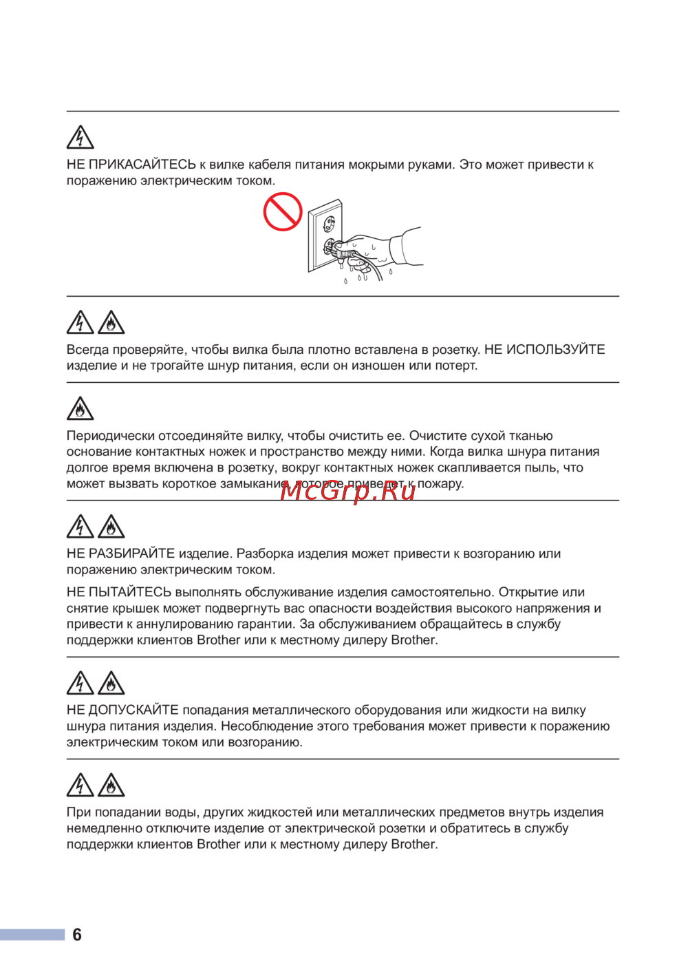НЕ ПРИКАСАЙТЕСЬ к вилке кабеля питания мокрыми руками. Это может привести к