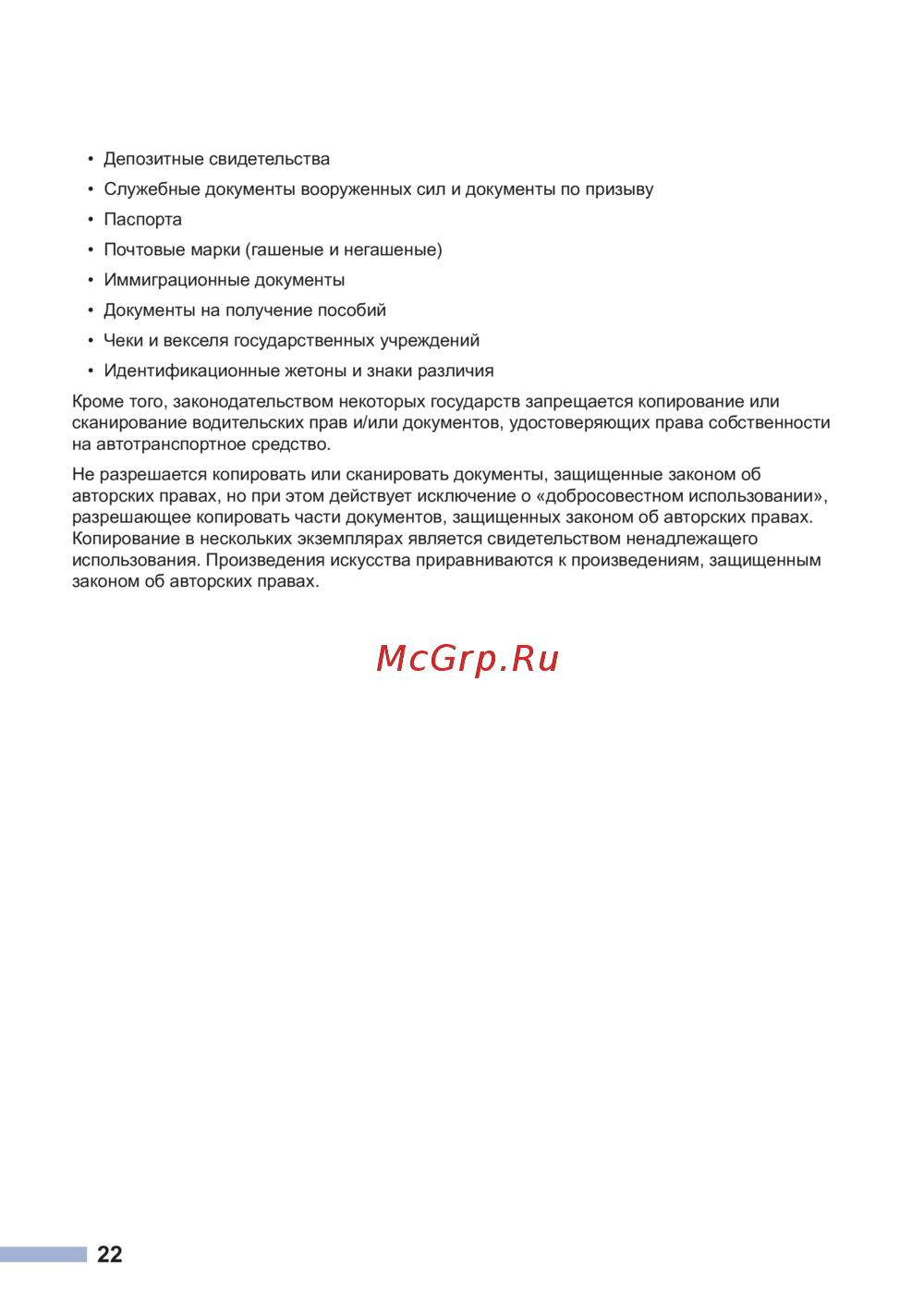 Не разрешается копировать или сканировать документы, защищенные законом об