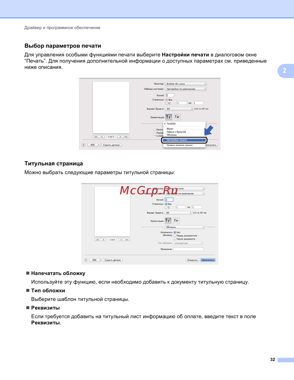 Brother HL-1200R — настройки печати: управление параметрами и титульной страницей [40/85]