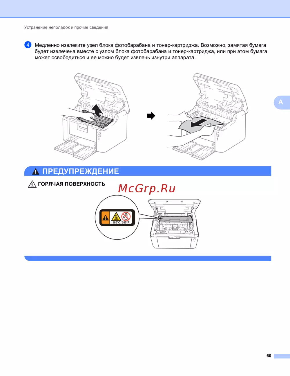 - Медленно извлеките узел блока фотобарабана и тонер картриджа возможно замятая бумага будет извлечена вместе с узлом блока фотобарабана и тонер картриджа или при этом бумага может освободиться и ее можно будет извлечь изнутри аппарата p.68