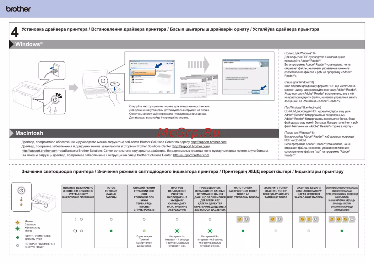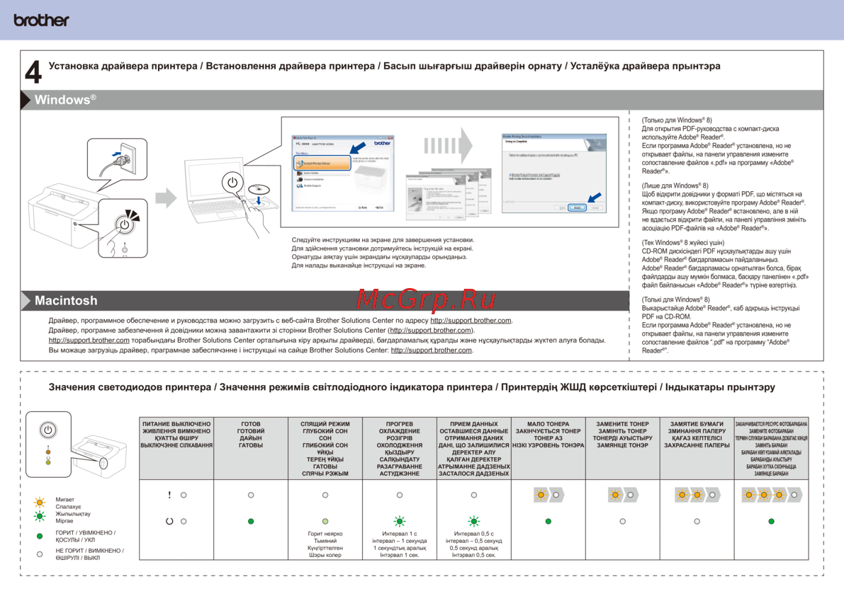 Значения светодиодов принтера / Значення режимів світлодіодного індикатора принтера / Принтердің ЖШД көрсеткіштері / Iндыкатары прынтэру