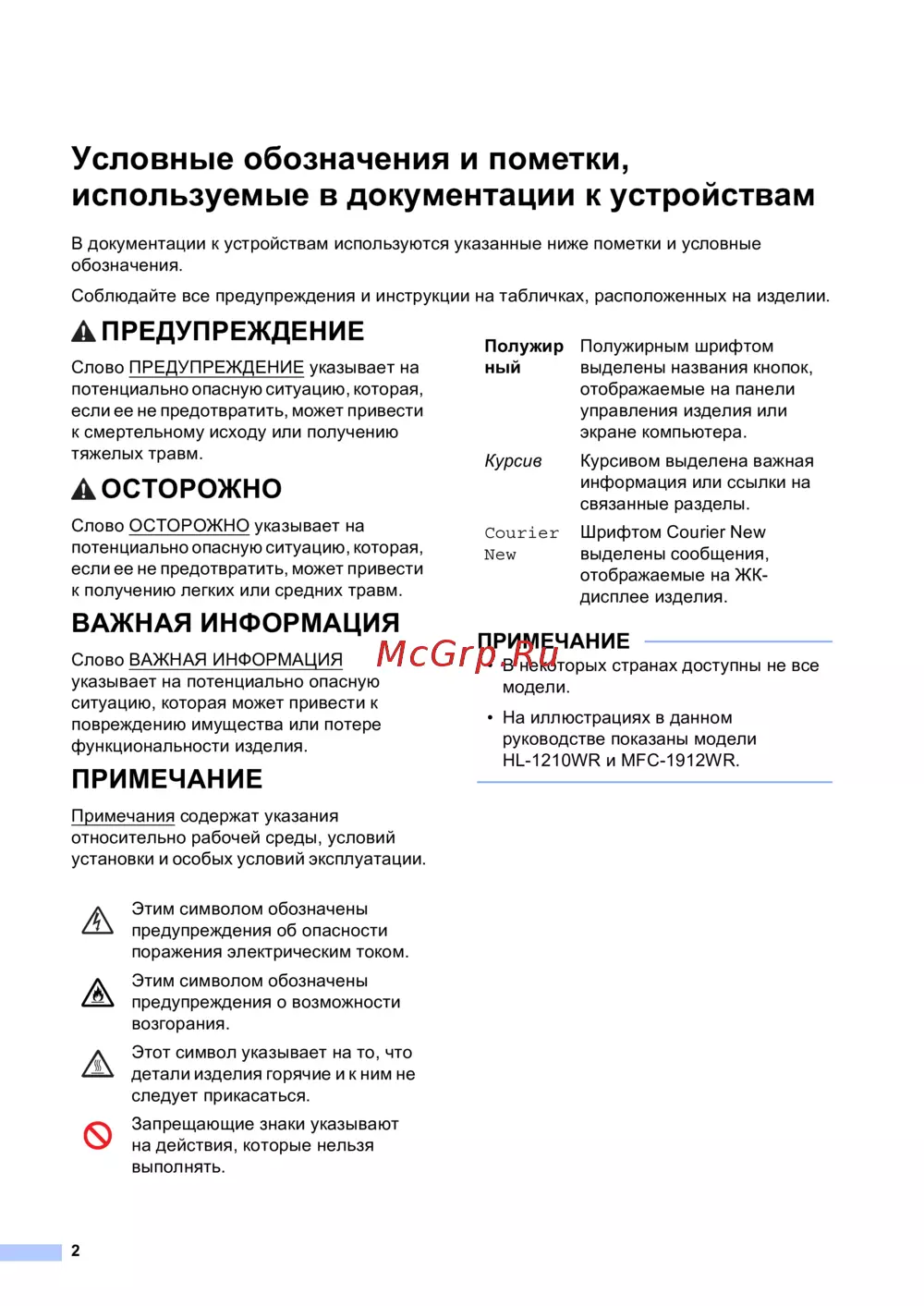 Brother HL-1200R — условные обозначения и пометки в документации к устройствам [2/24]