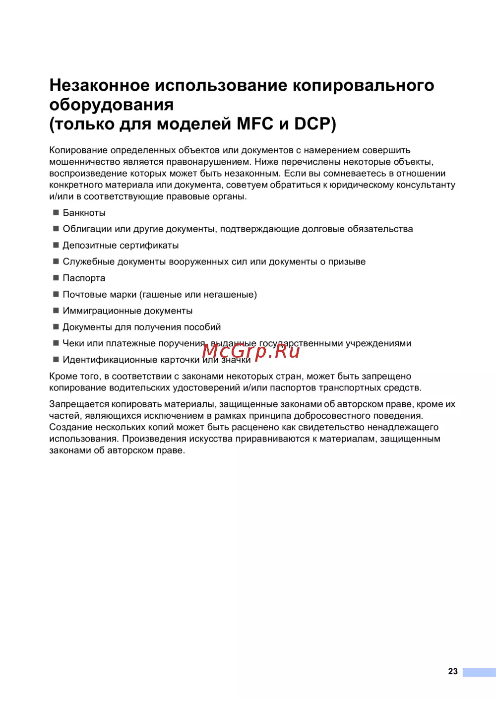 - Незаконное использование копировального оборудования только для моделей mfc и dcp p.23