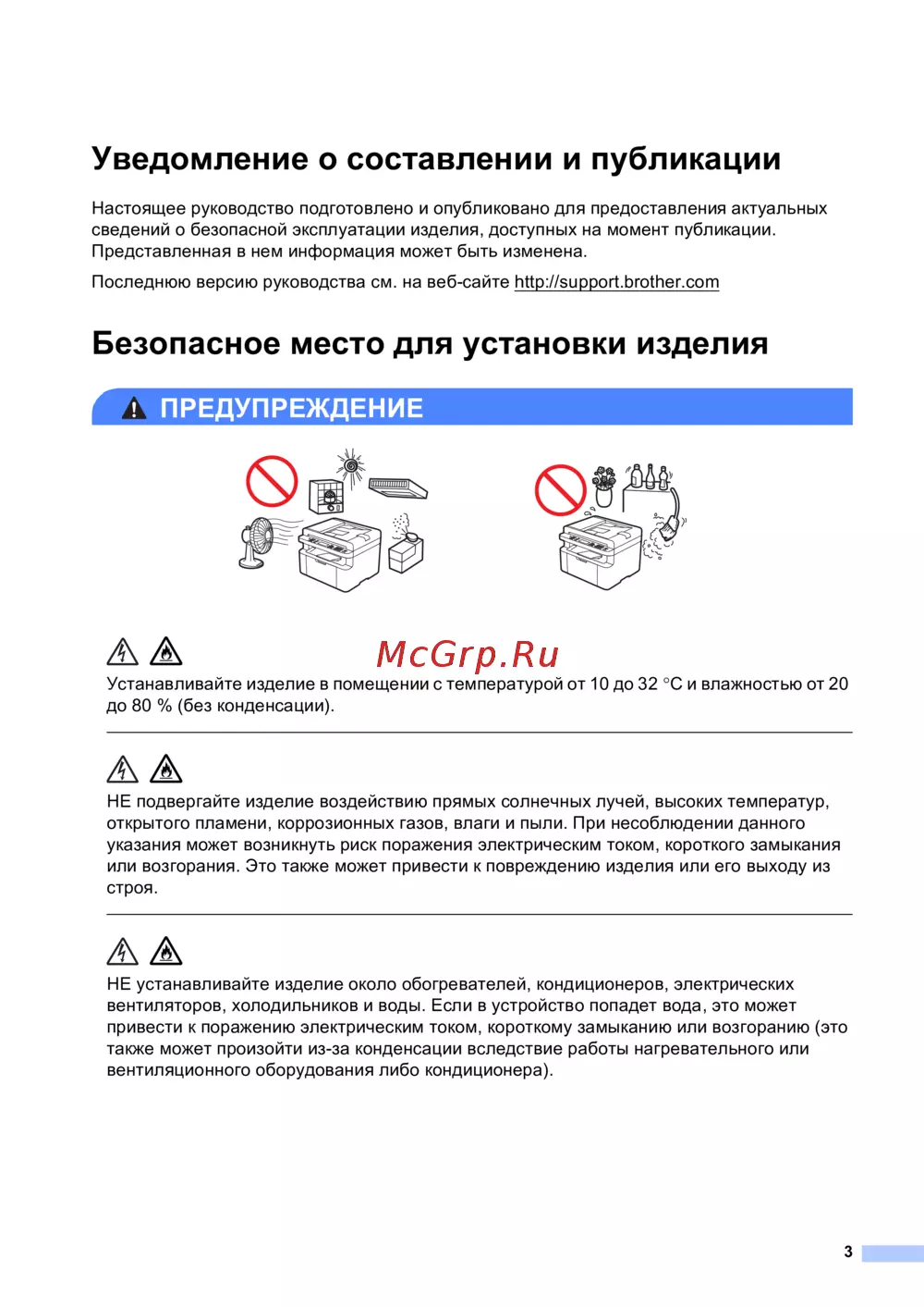 Brother HL-1200R — руководство по эксплуатации Brother: условия установки и безопасность [3/24]