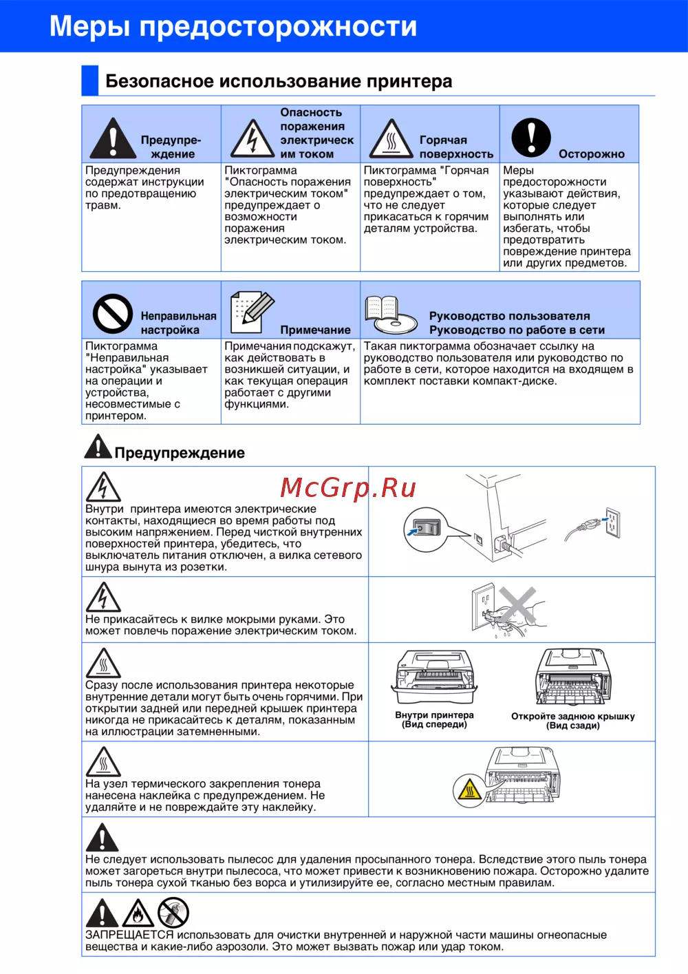 Узнайте о мерах предосторожности и безопасном использовании принтера. Следуйте инструкциям, чтобы избежать травм и повреждений устройства.