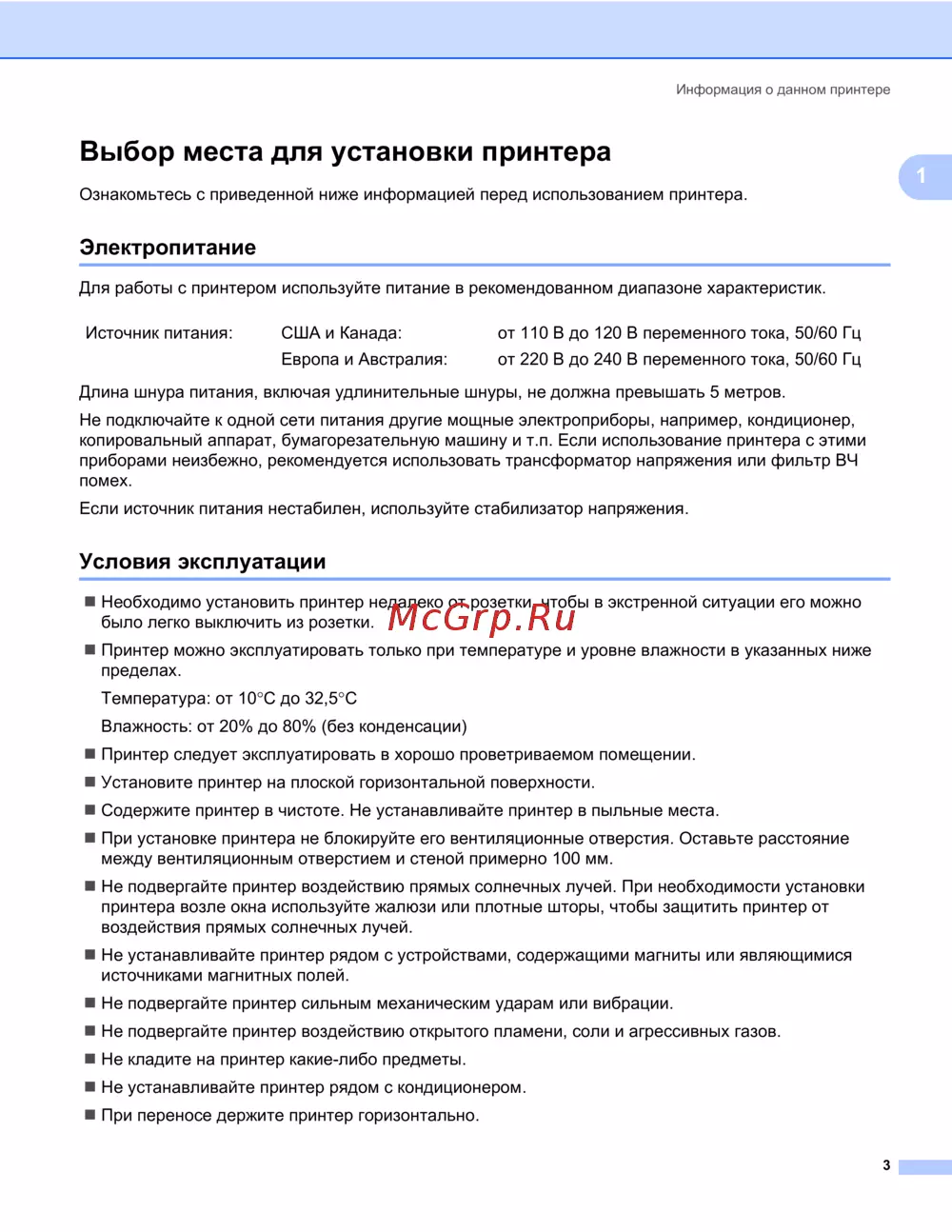 Узнайте, как правильно установить и эксплуатировать принтер для обеспечения его долговечной работы. Следуйте рекомендациям по электропитанию и условиям эксплуатации.