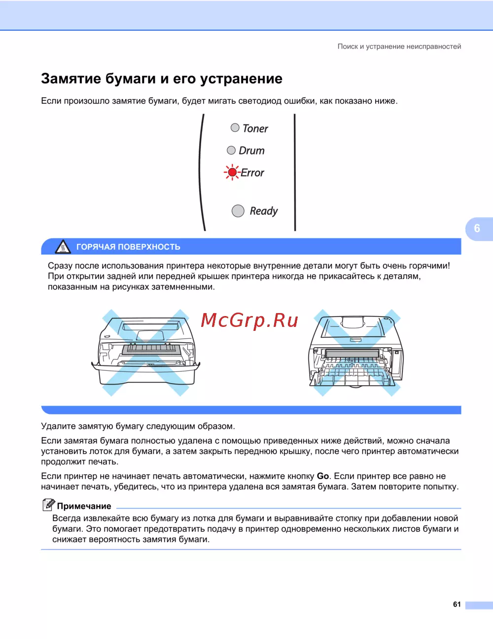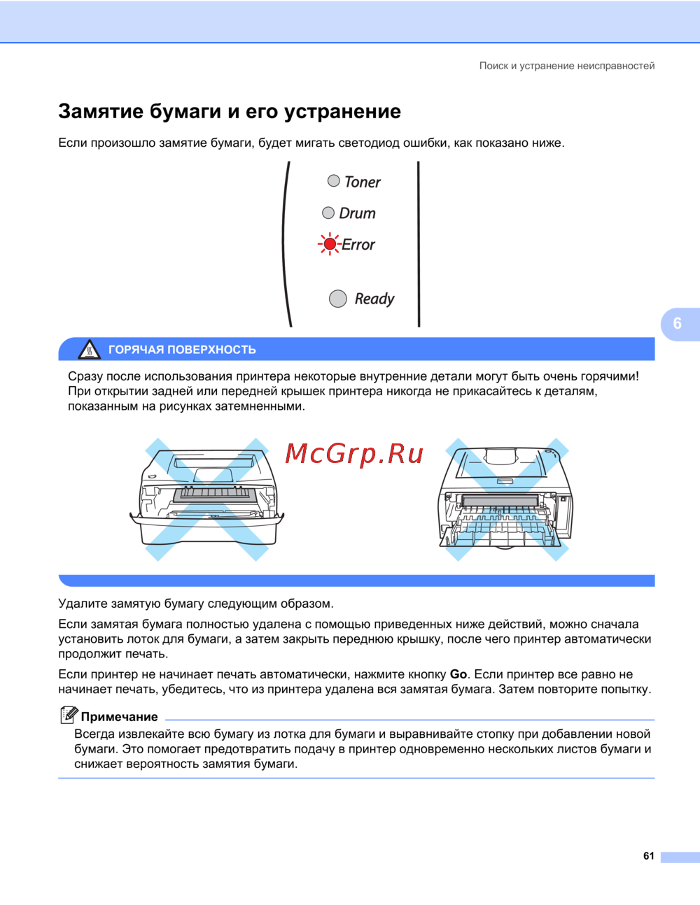 - Сразу после использования принтера некоторые внутренние детали могут быть очень горячими дождитесь когда принтер остынет прежде чем прикасаться к его внутренним деталям p.61