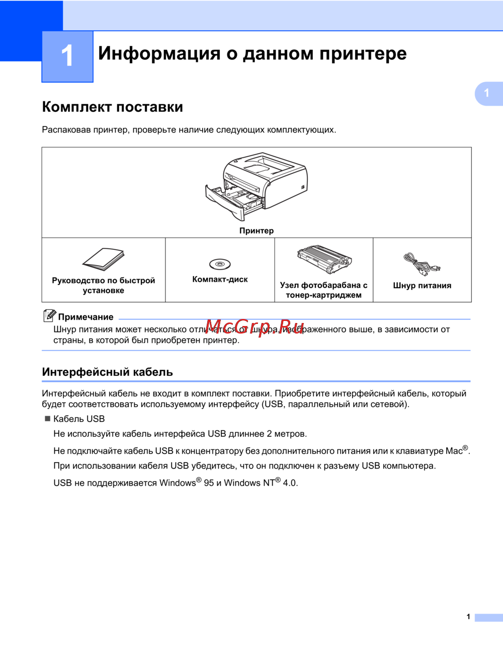 Узнайте, что входит в комплект поставки принтера и как правильно подключить интерфейсный кабель. Важные советы по использованию и настройке.