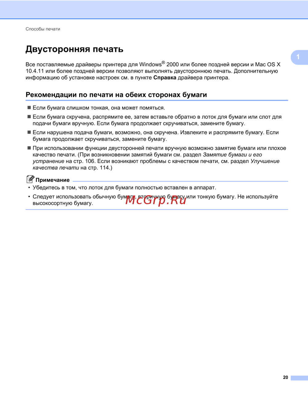 - Сначала убедитесь в том что используемая бумага соответствует рекомендуемым спецификациям компании brother см раздел допустимая бумага и другие материалы для печати на стр 3 p.108
