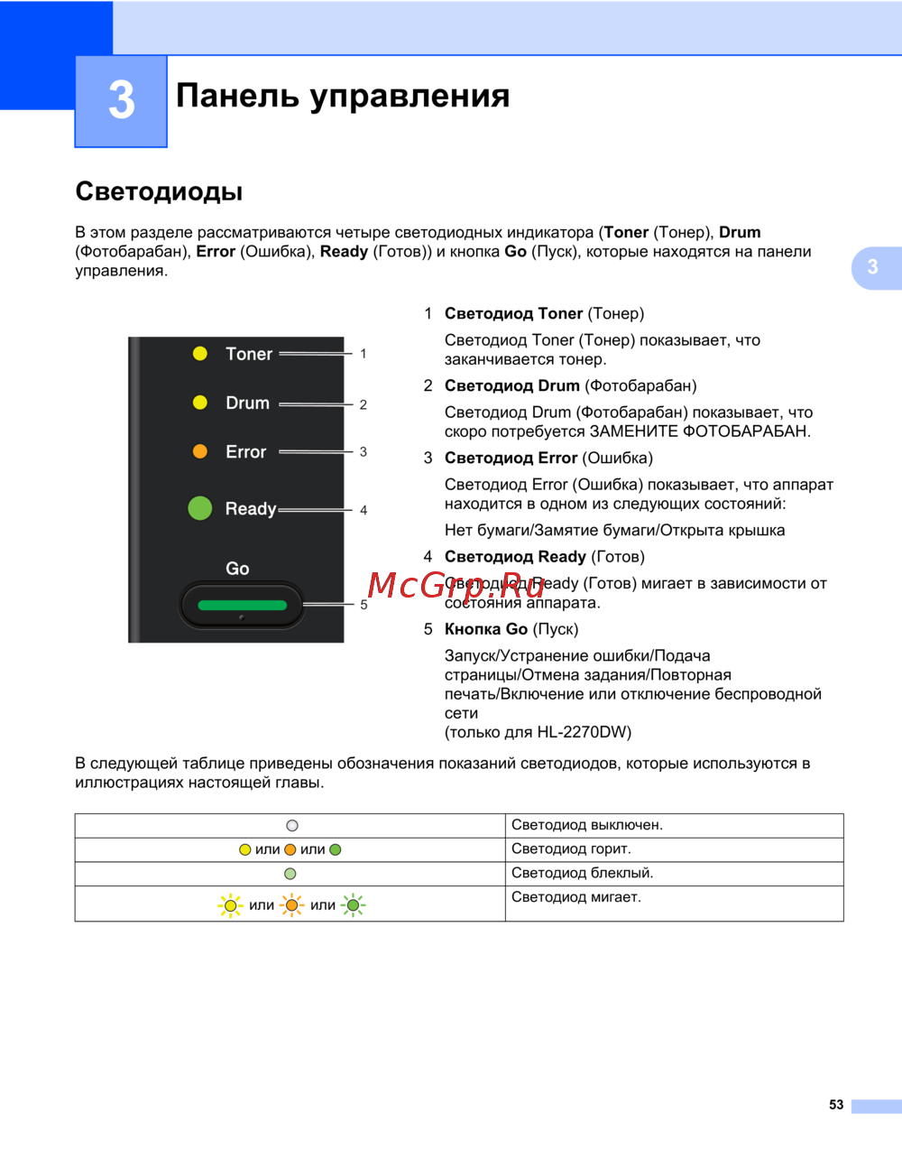 (Фотобарабан), Error (Ошибка), Ready (Готов)) и кнопка Go (Пуск), которые находятся на панели