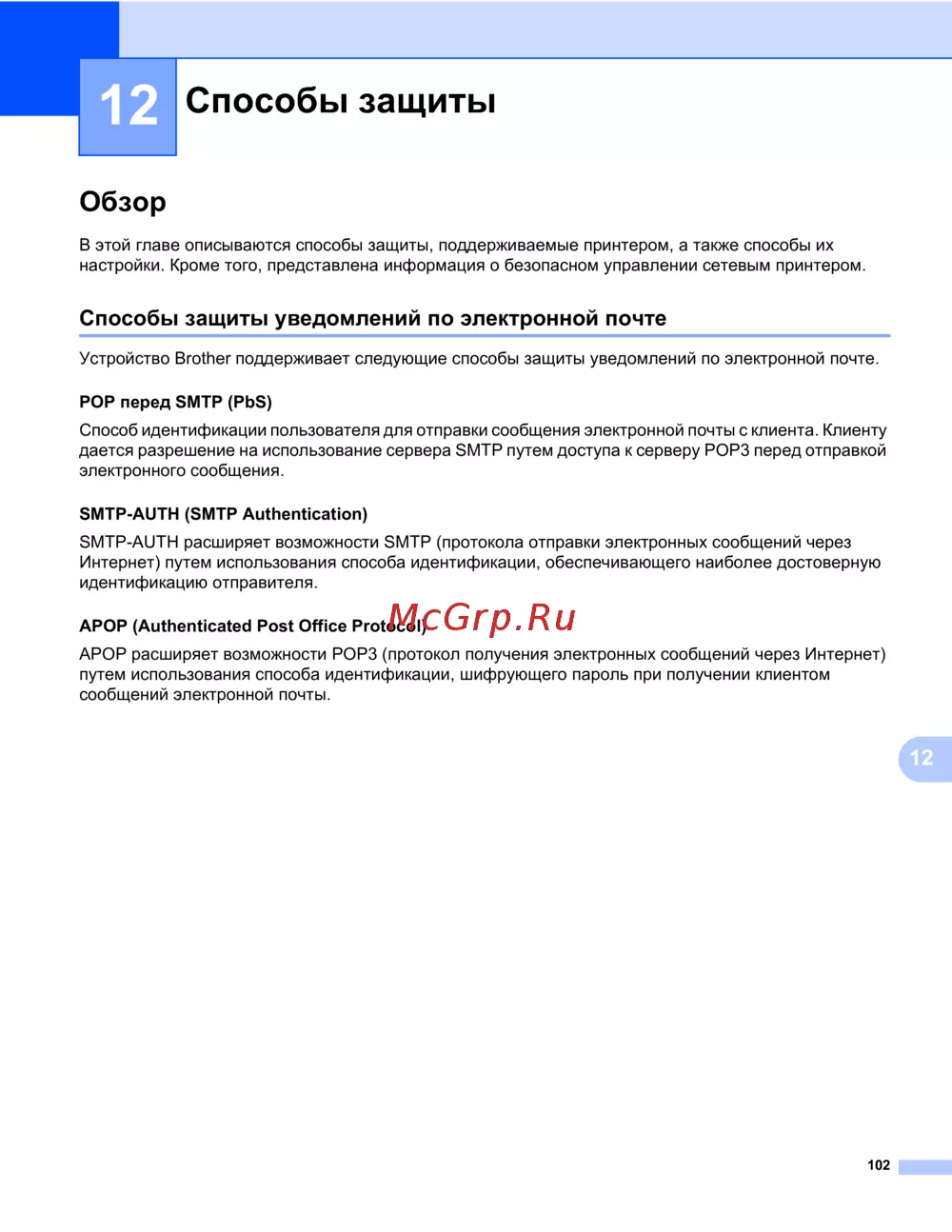 Устройство Brother поддерживает следующие способы защиты уведомлений по электронной почте.