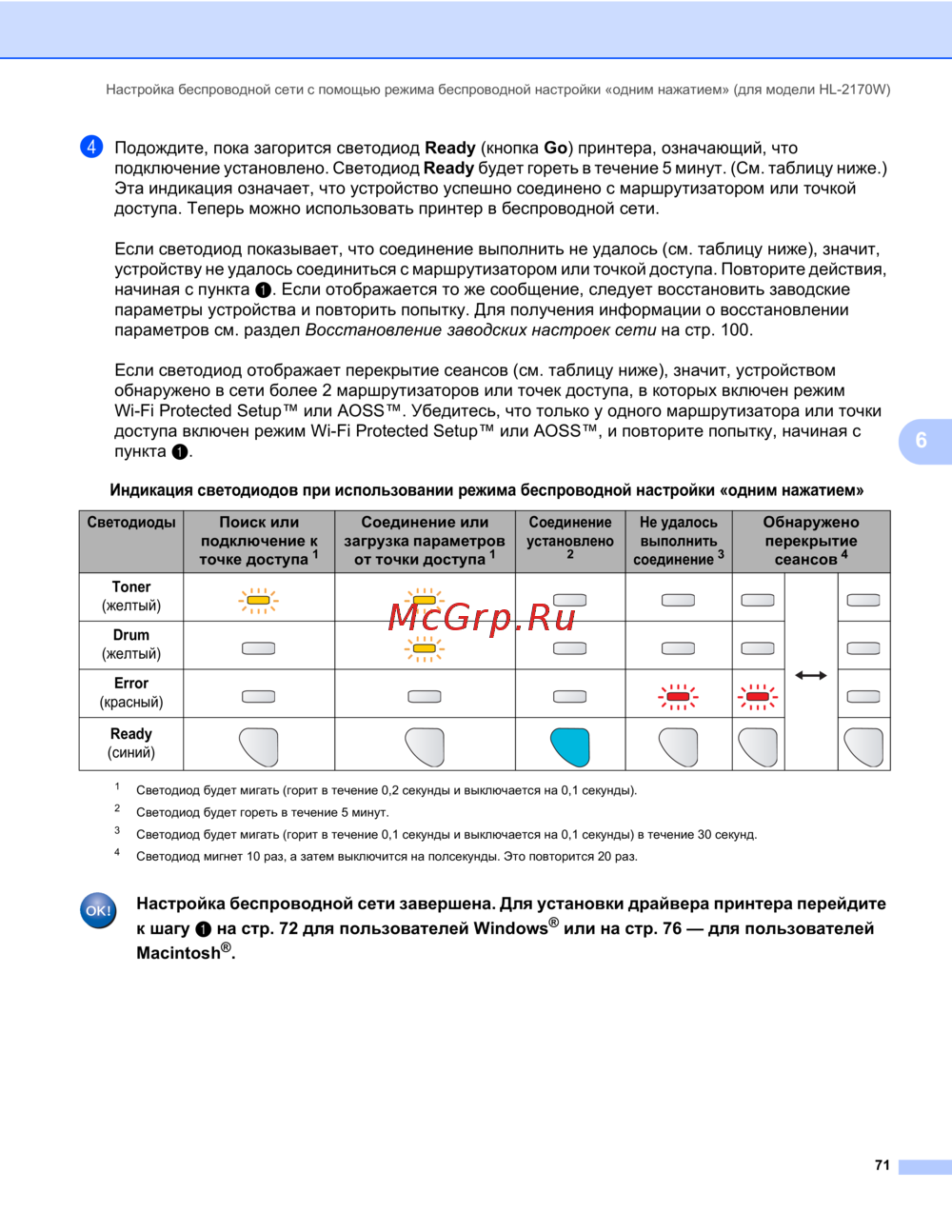 - Настройка беспроводной сети с помощью режима беспроводной настройки одним нажатием для модели hl 2170w 69 p.5