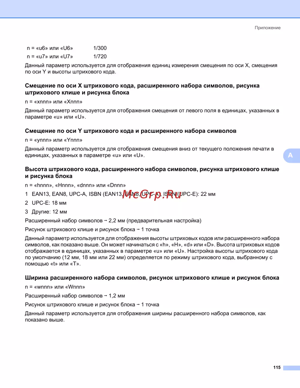 - Смещение по оси y штрихового кода и расширенного набора символов p.122