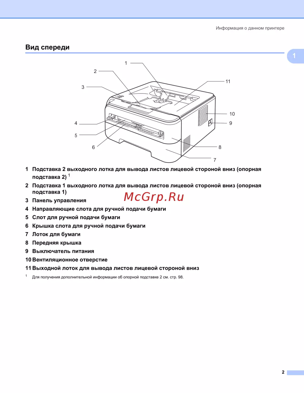 2 Подставка 1 выходного лотка для вывода листов лицевой стороной вниз (опорная