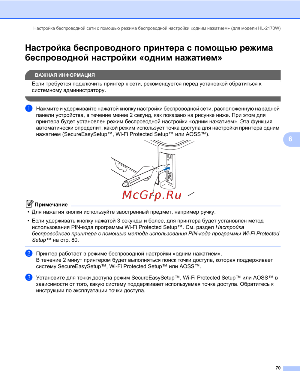 - Настройка беспроводной сети с помощью режима беспроводной настройки одним нажатием для модели hl 2170w 69 p.5