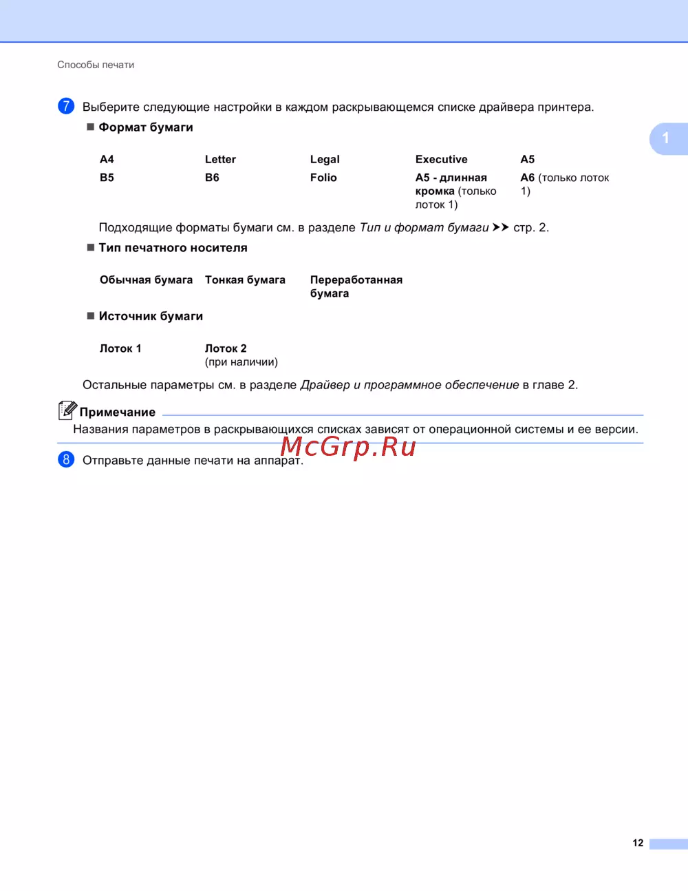 - Далее приводятся названия лотков для бумаги в драйвере принтера и данном руководстве p.8