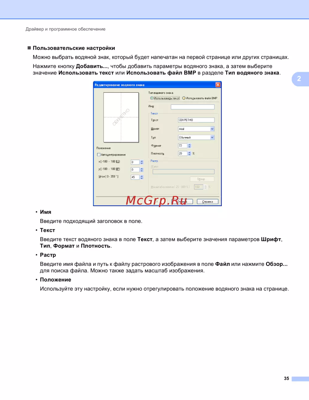 тройку, если нужно отрегулировать положение водяного знака на странице.