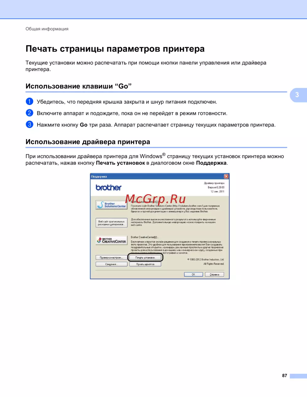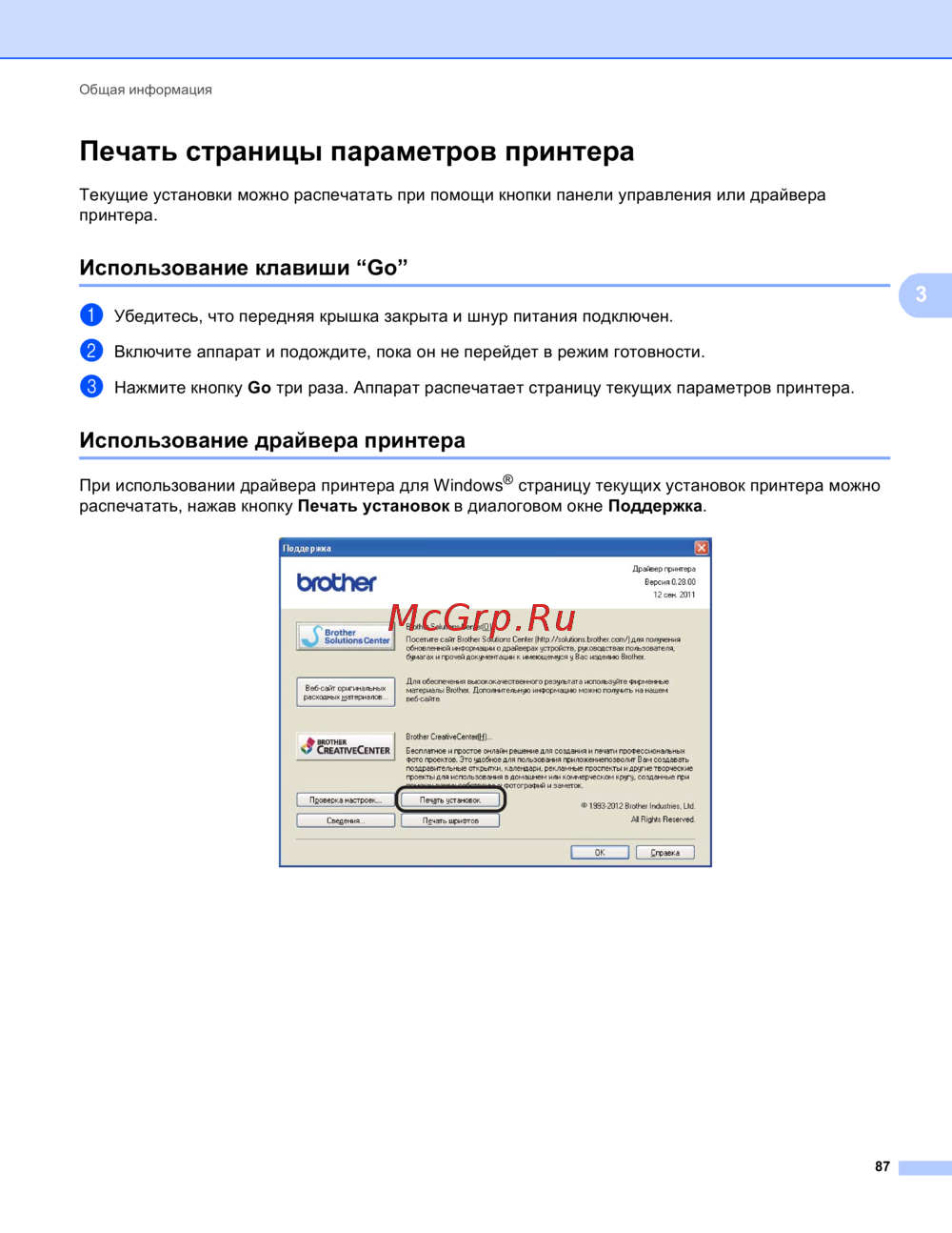 c Нажмите кнопку Go три раза. Аппарат распечатает страницу текущих параметров принтера.