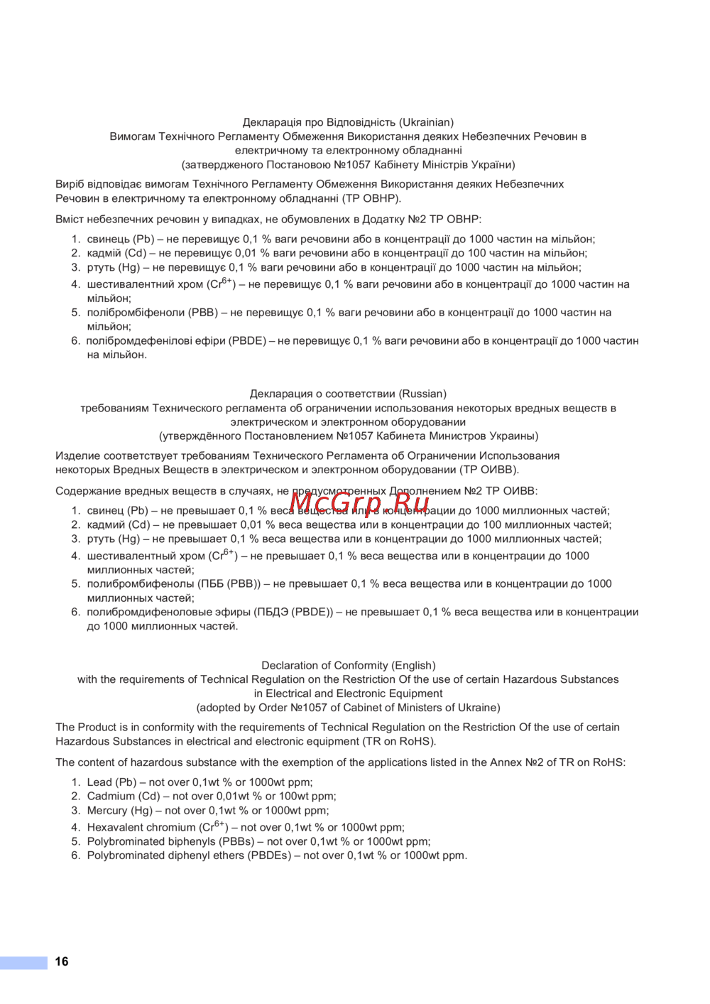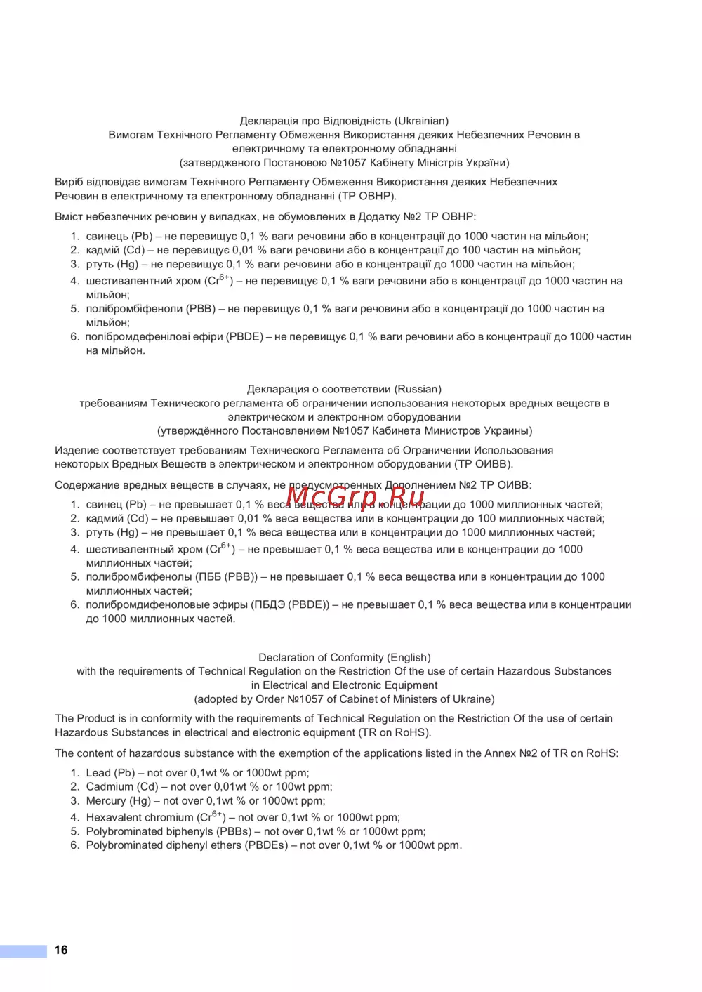 Декларація підтверджує відповідність виробу вимогам технічного регламенту щодо обмеження використання небезпечних речовин в електричному та електронному обладнанні.