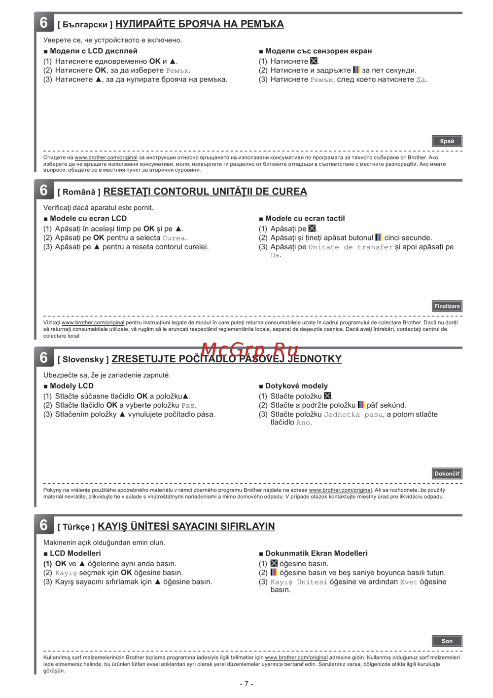 Kullanılmış sarf malzemelerinizin Brother toplama programına iadesiyle ilgili talimatlar için www.brother.com/original adresine gidin.