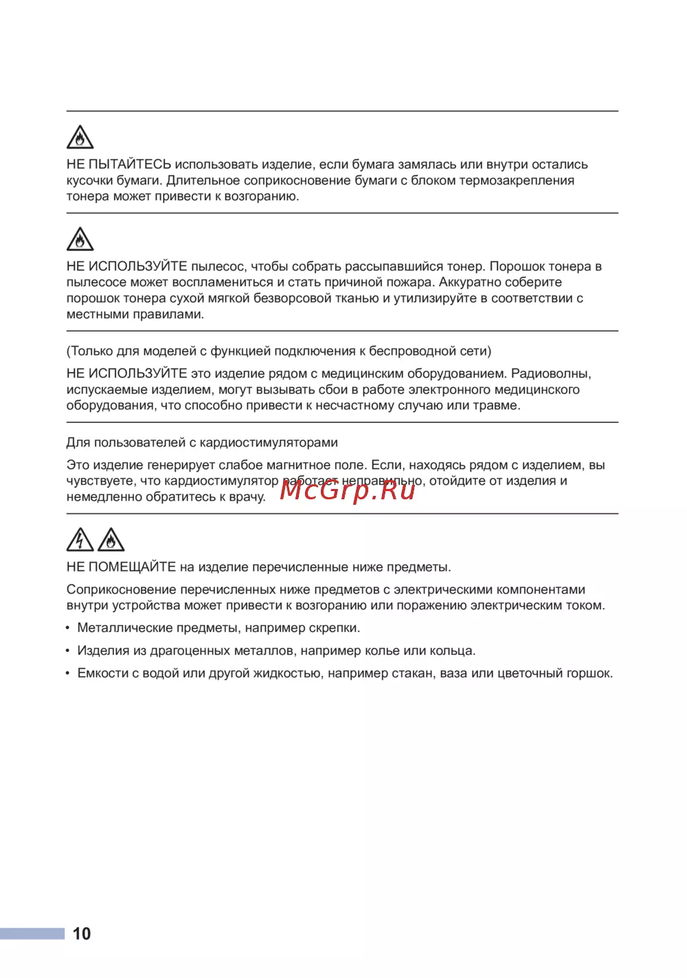 Узнайте, как правильно использовать устройство, чтобы избежать возгораний и повреждений. Следуйте рекомендациям по безопасной утилизации тонера и соблюдайте меры предосторожности.