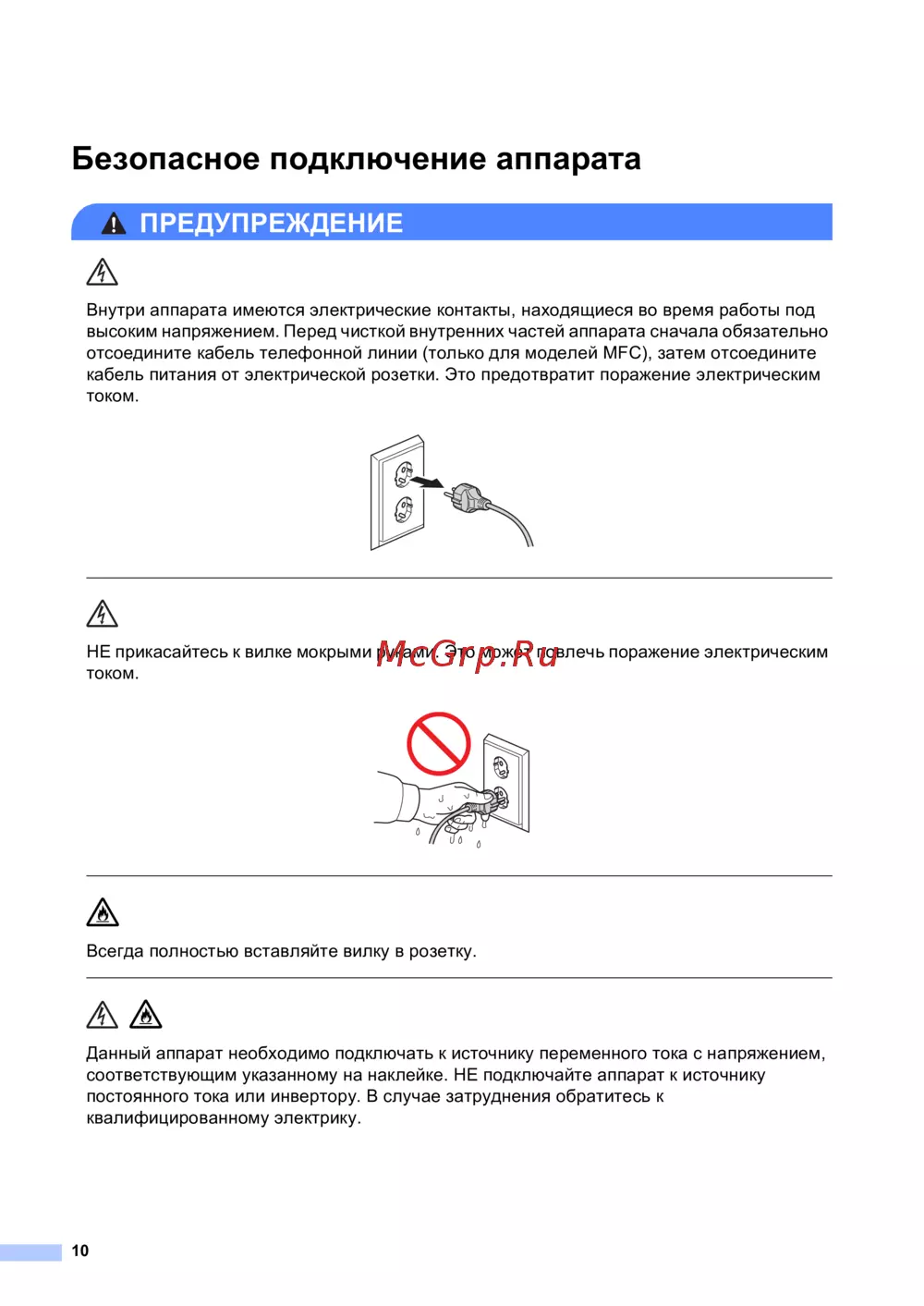 Brother MFC-1810R — безопасное подключение электрического аппарата: важные рекомендации [10/19]