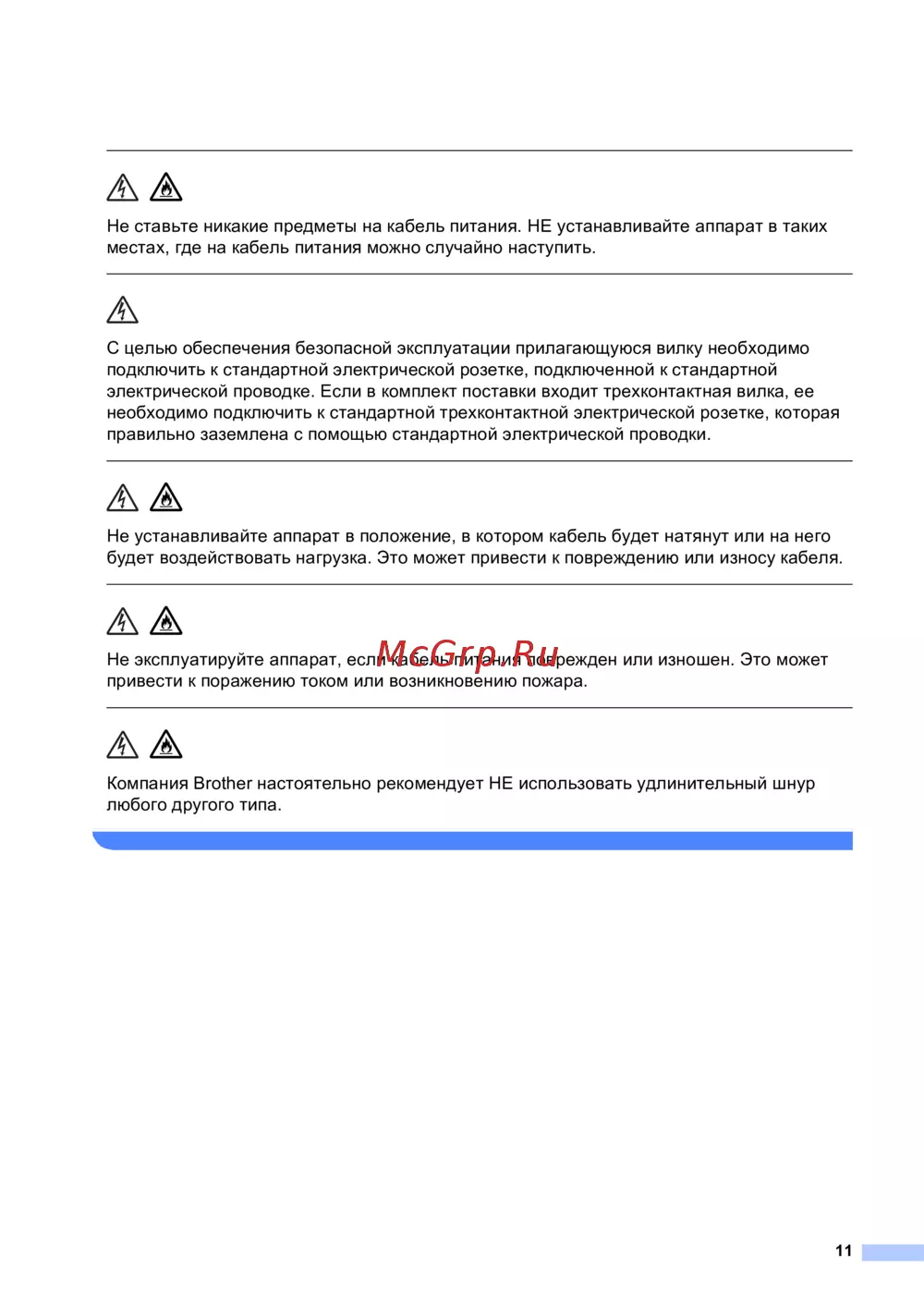 Brother MFC-1810R — безопасная эксплуатация электрических устройств и кабелей питания [11/19]