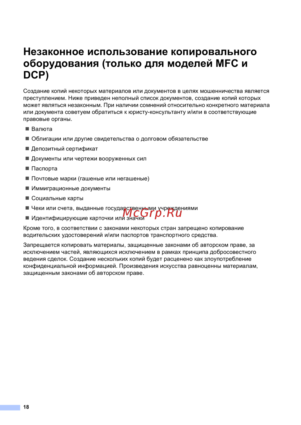 - Незаконное использование копировального оборудования только для моделей mfc и dcp p.18