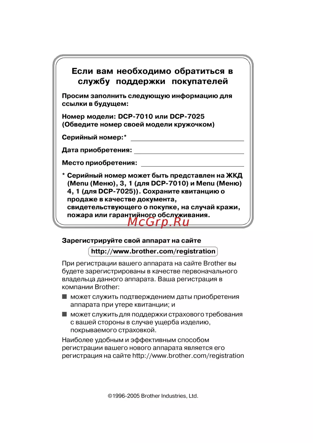 Brother DCP 7010 — регистрация и поддержка покупателей: важная информация [2/70]