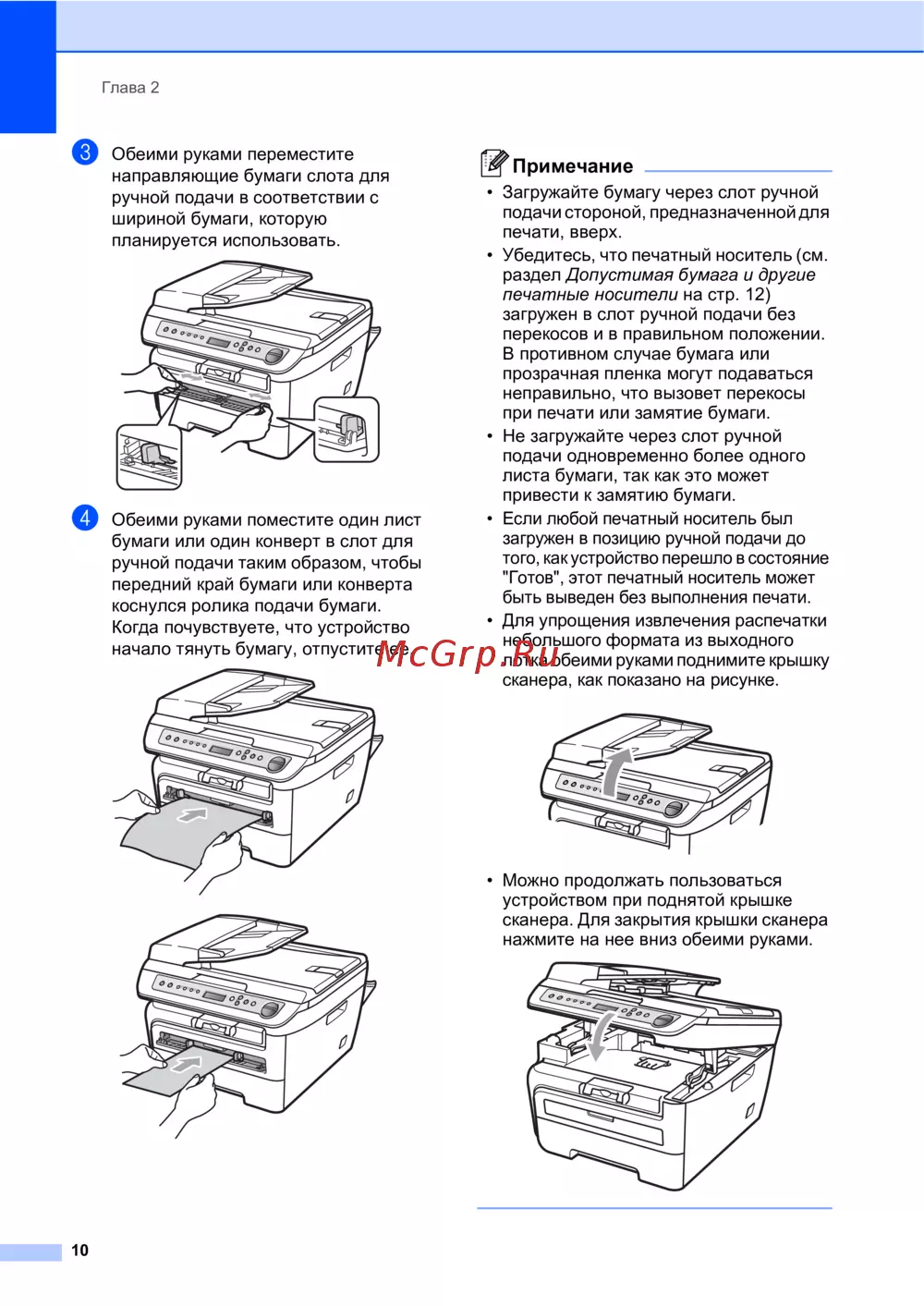 Brother DCP-7040 — как правильно загружать бумагу в ручной подачу устройства [16/107]